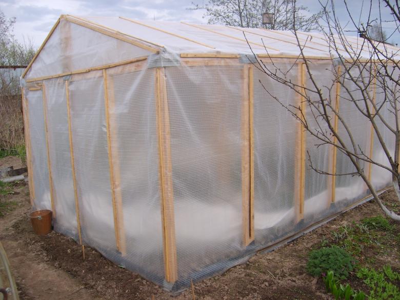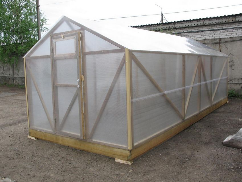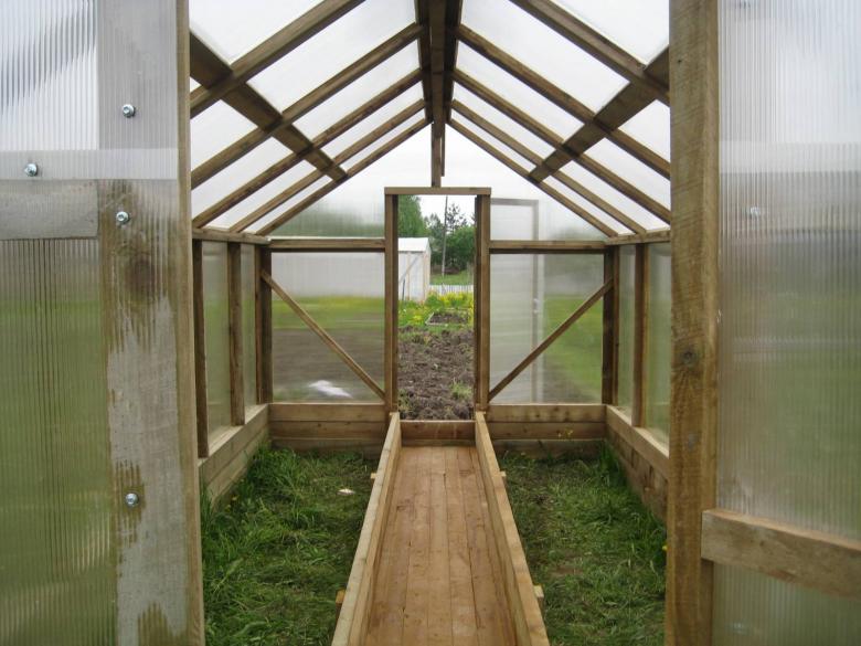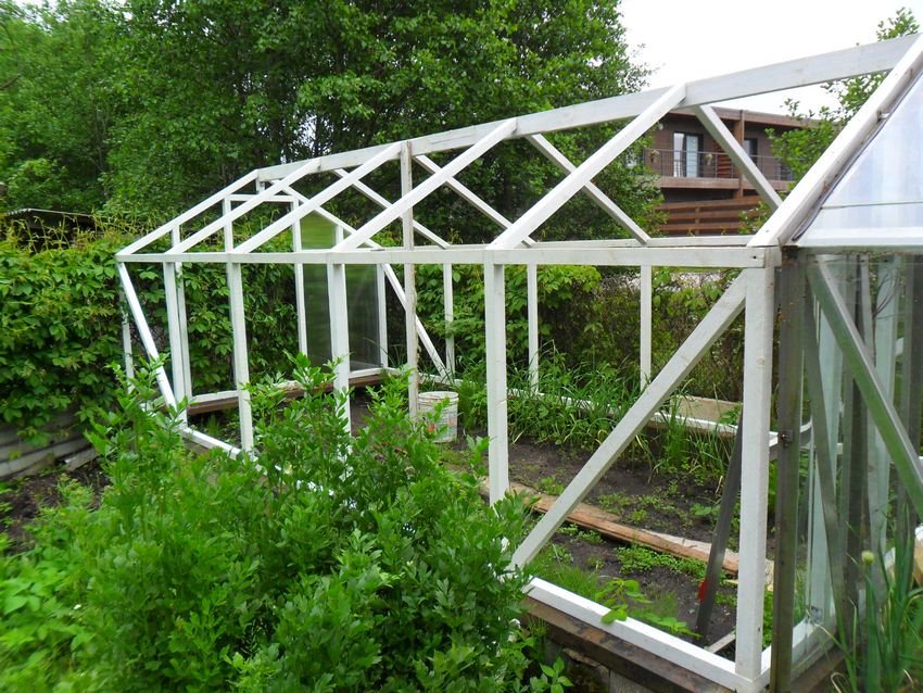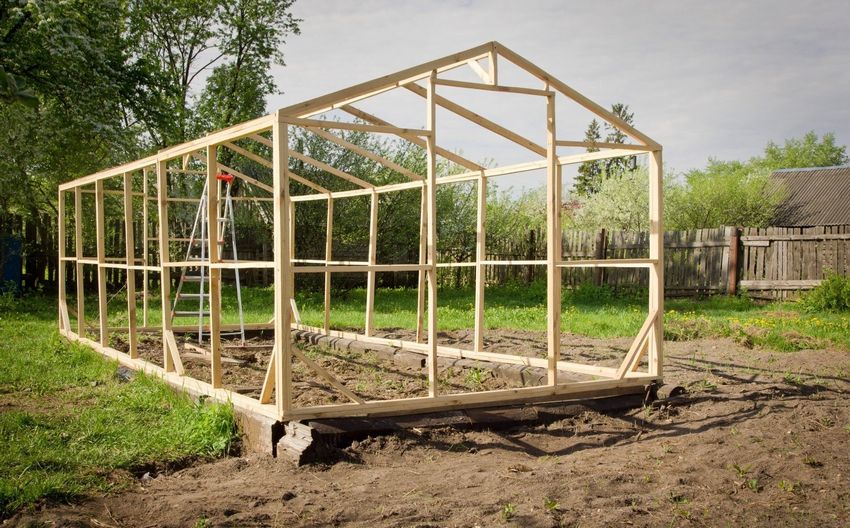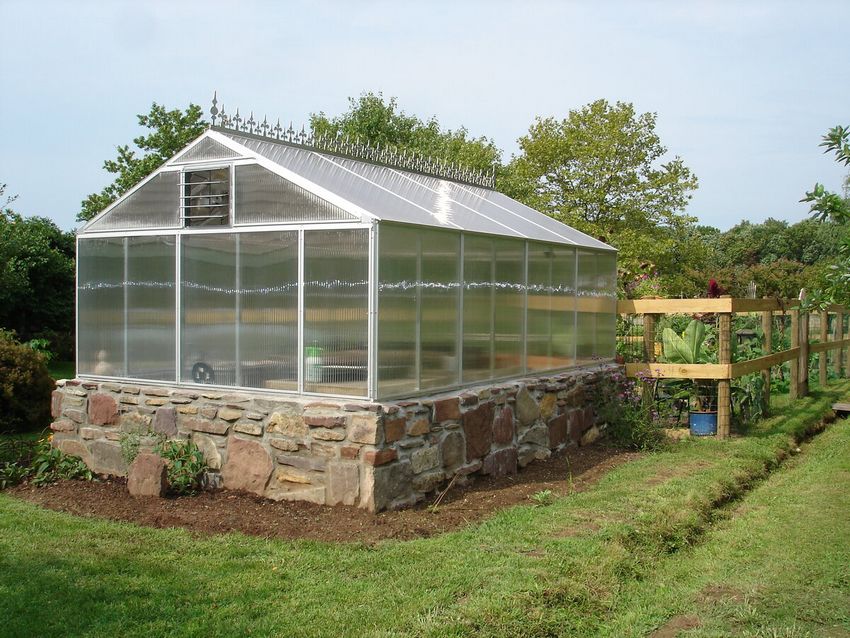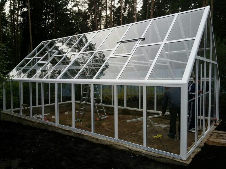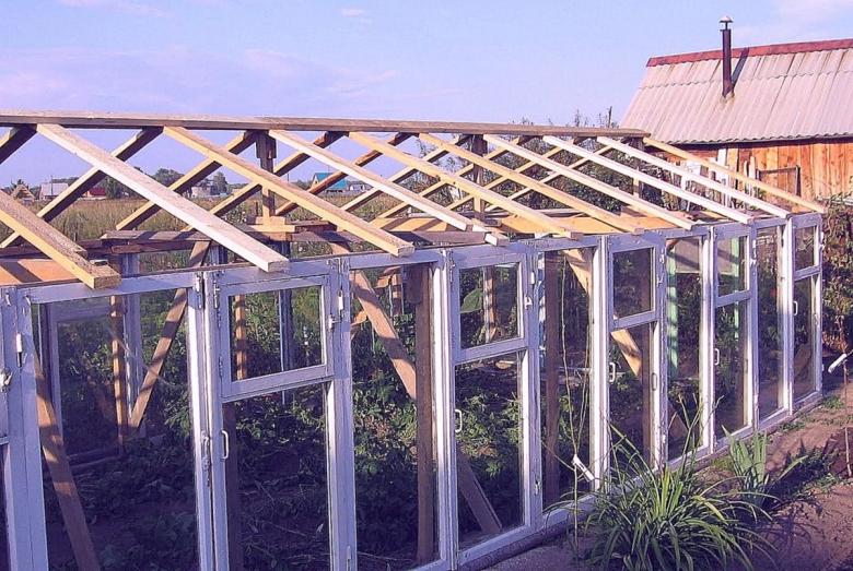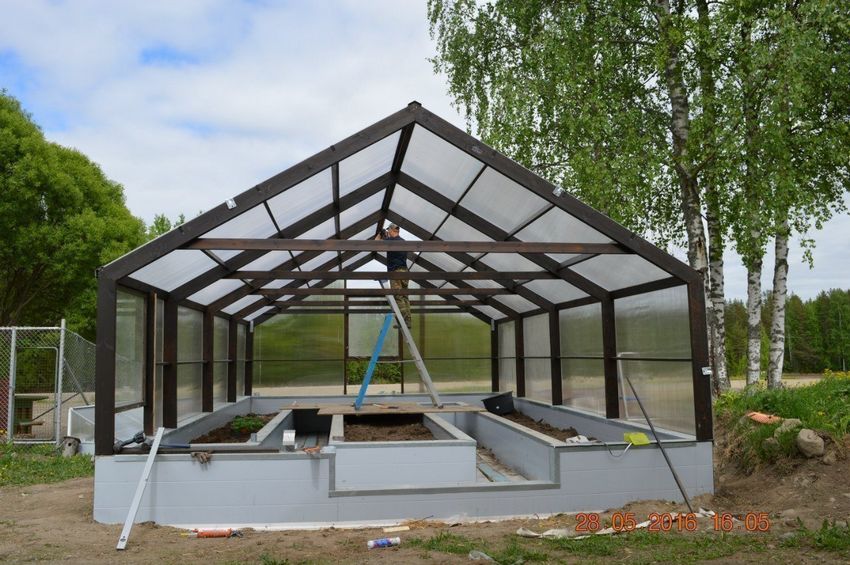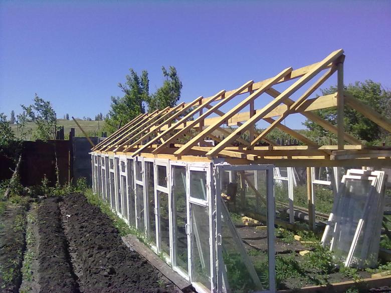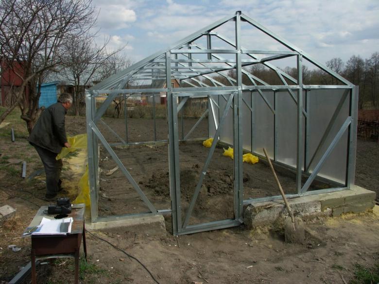 Les supports verticaux d'angle y sont fixés, entre lesquels sont montés les cadres. Les joints sont remplis de mastic, isolés et recouverts d'une latte de bois. La serre s'avère assez lourde, les parois verticales sont donc renforcées par des consoles, et le toit est fait de chevrons en bois, fixés par une poutre faîtière et recouverts d'un film de polyéthylène.
