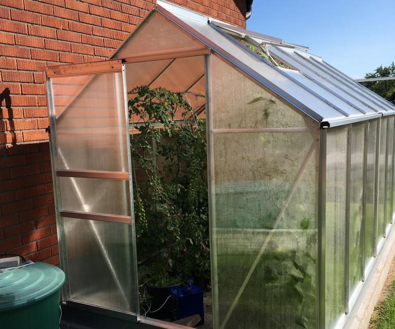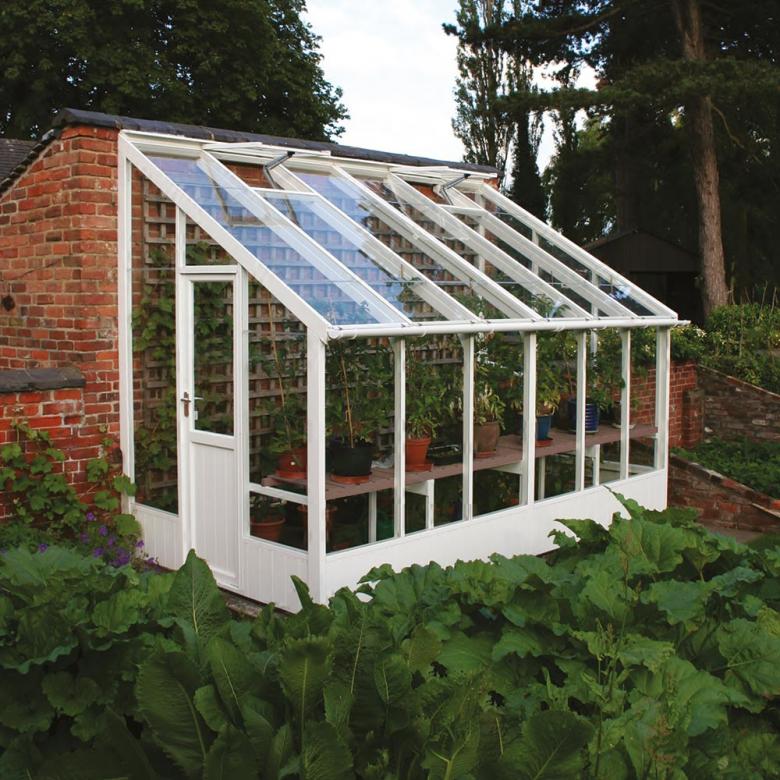 Une option très pratique pour une serre ouverte toute l'année. Sa particularité est son raccordement au mur de la maison.