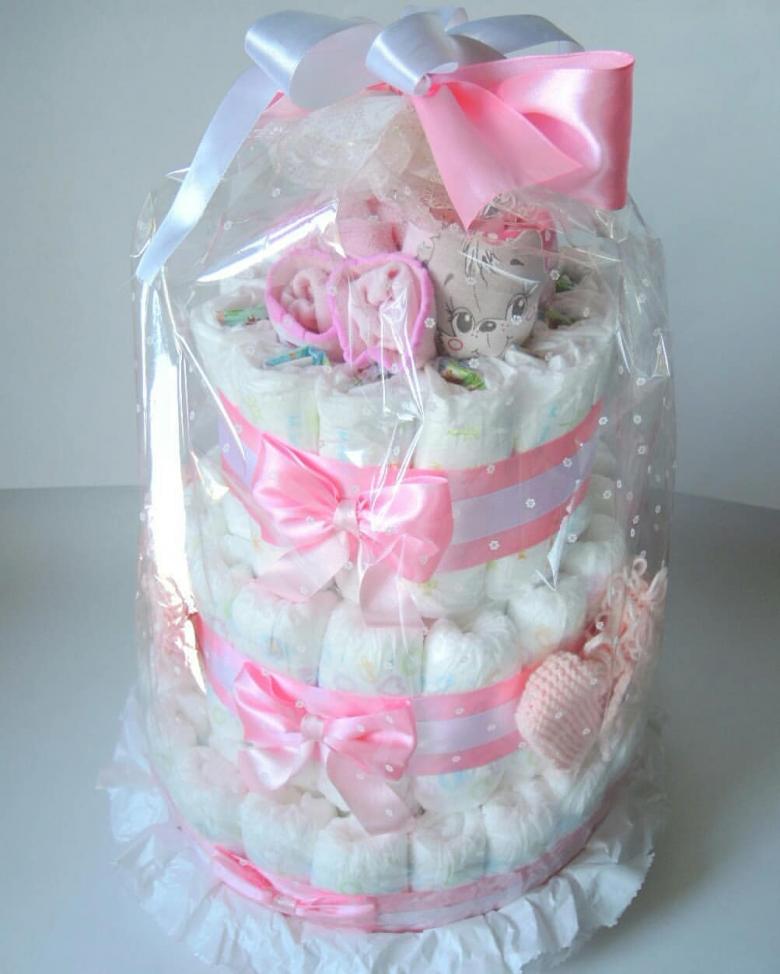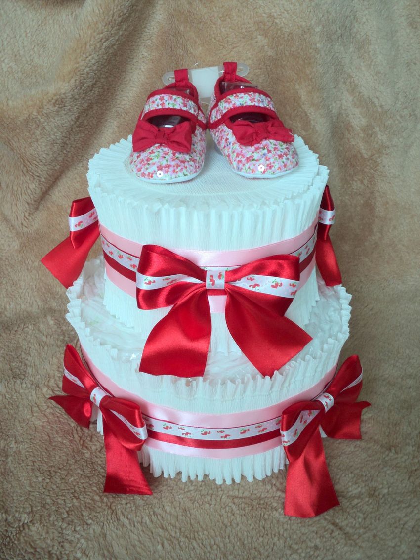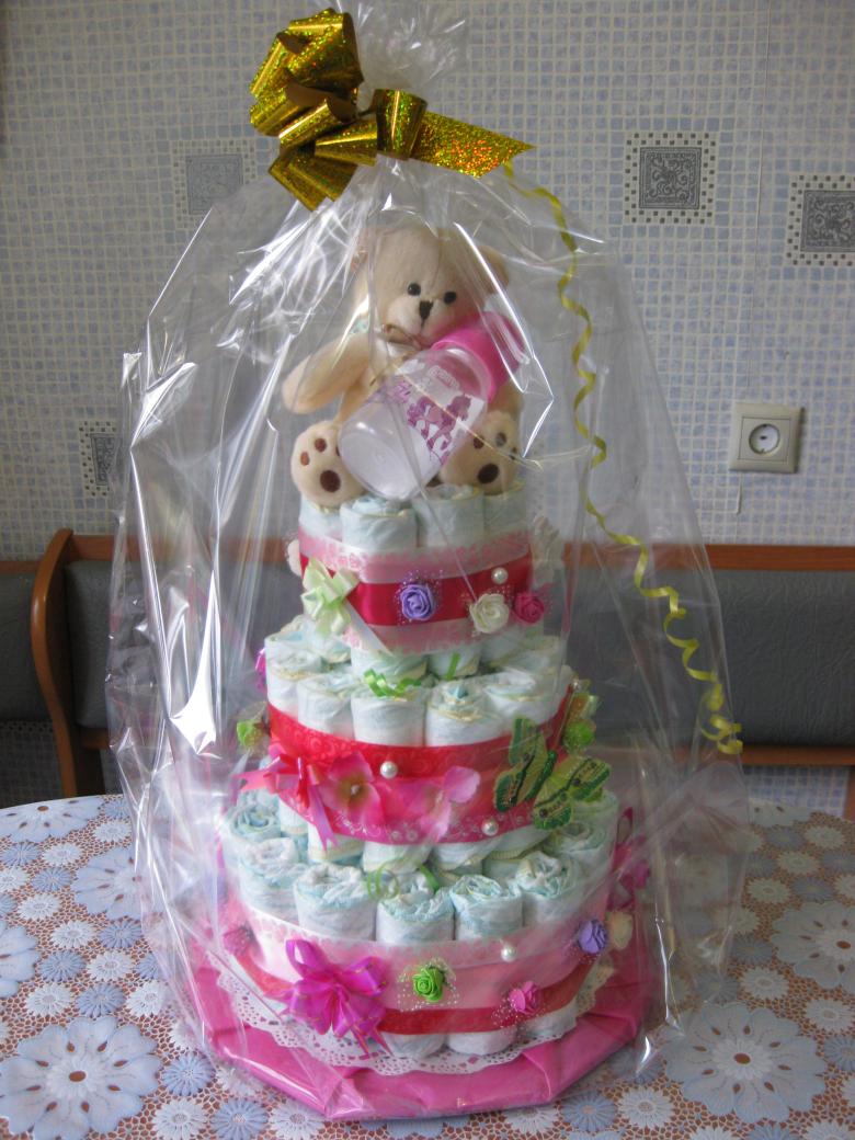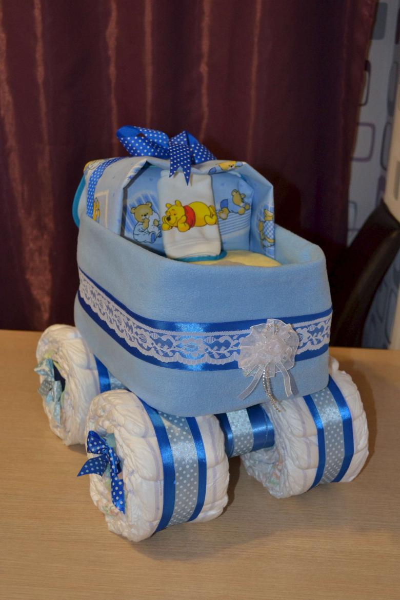 - panier cadeau. Les couches sont attachées en cercle et placées sur une base en carton, et le panier peut être rempli de toutes les choses utiles ;
