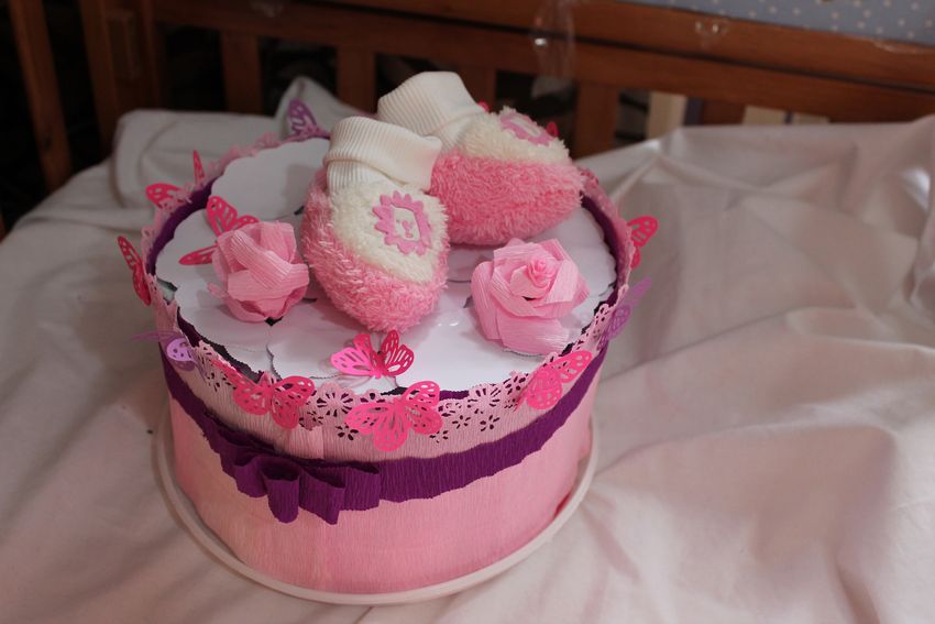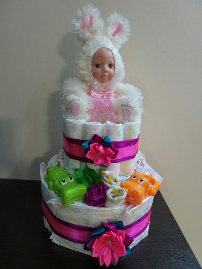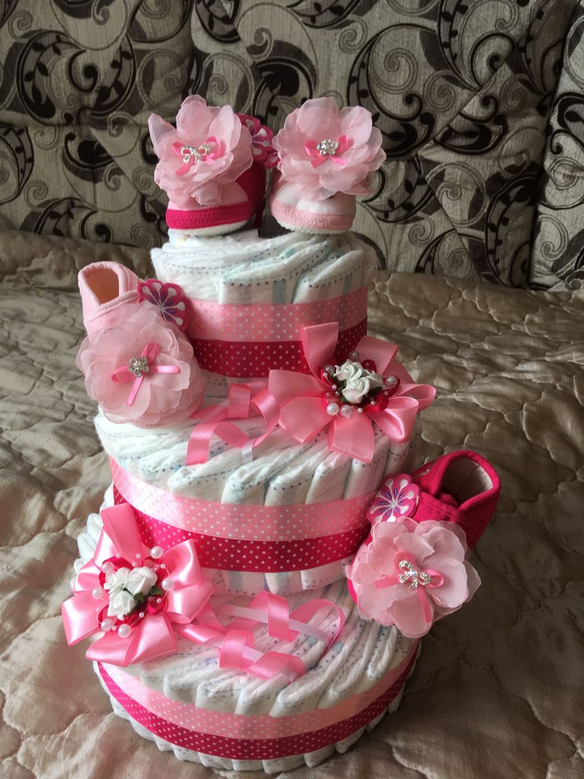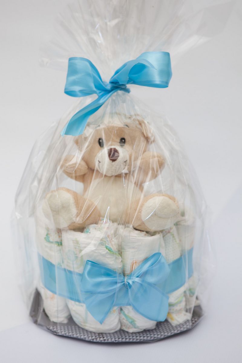 - panier cadeau. Les couches sont attachées en cercle et placées sur une base en carton, et le panier peut être rempli de toutes les choses utiles ;