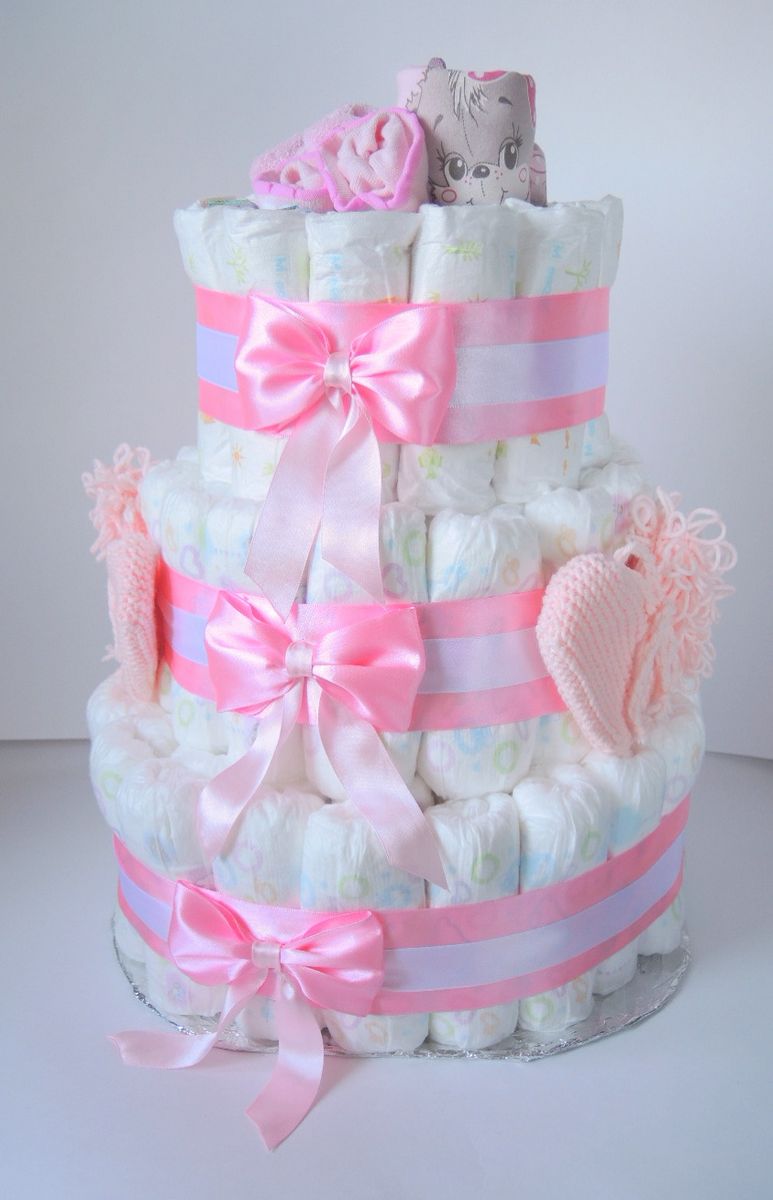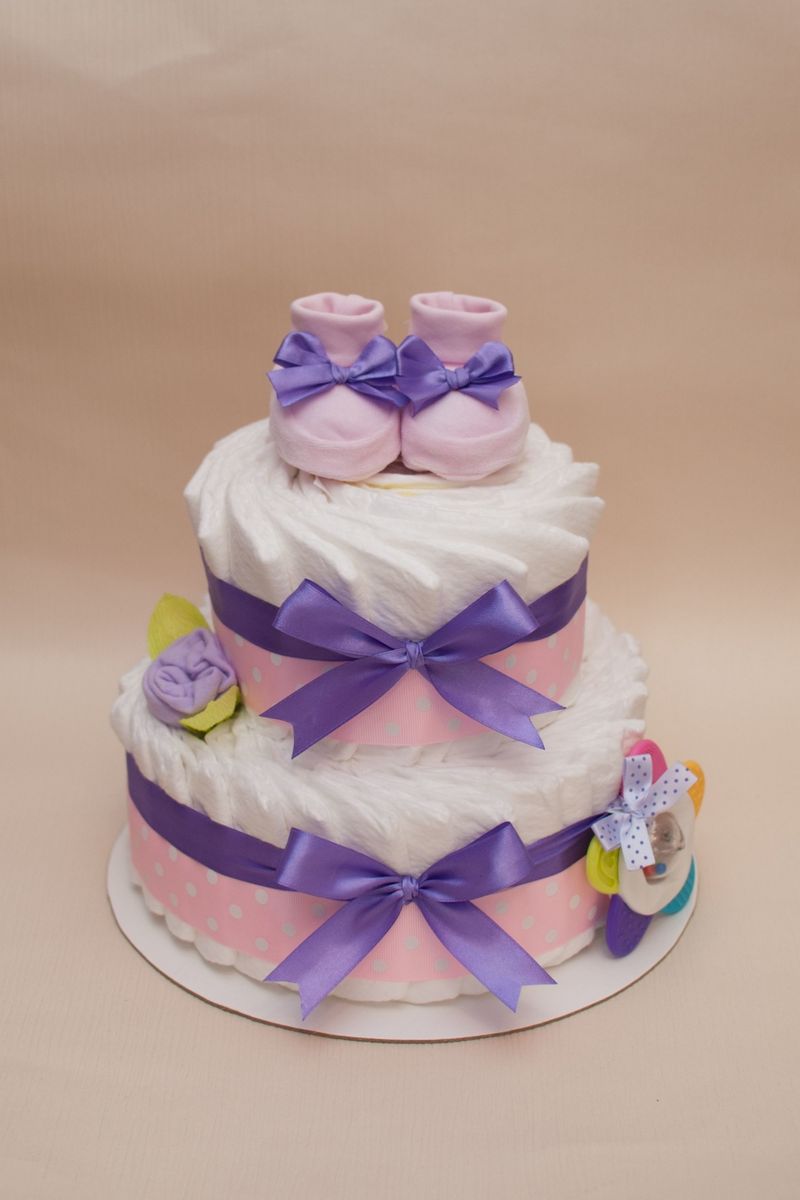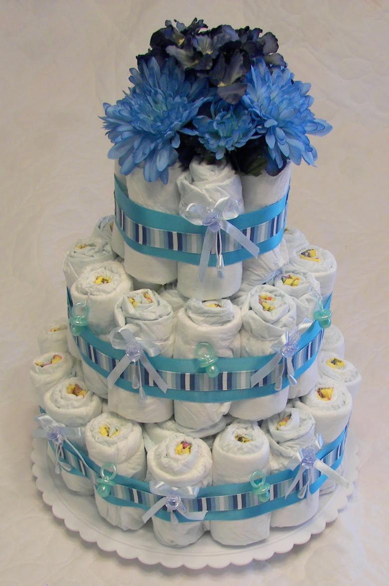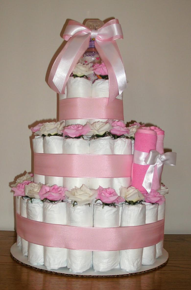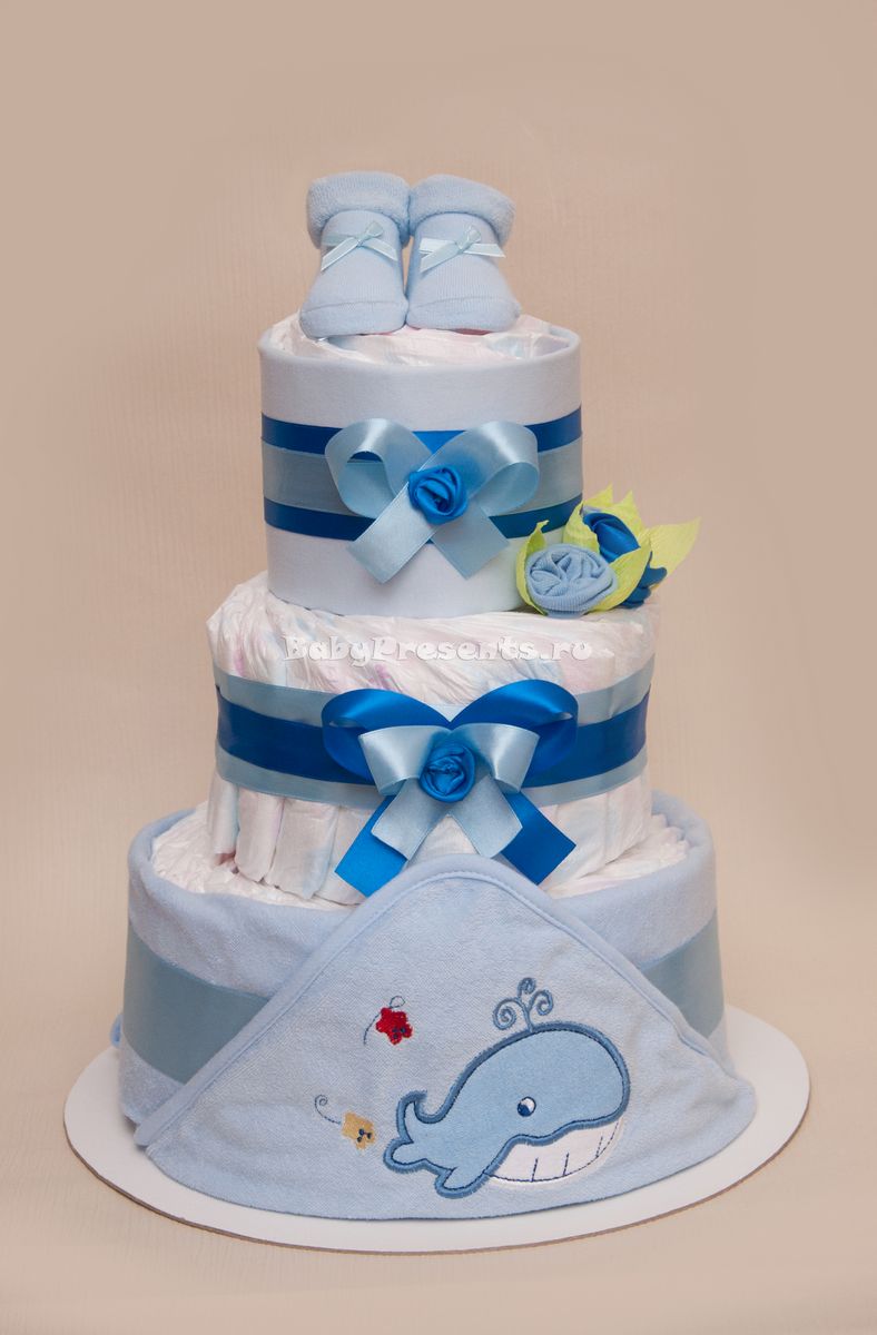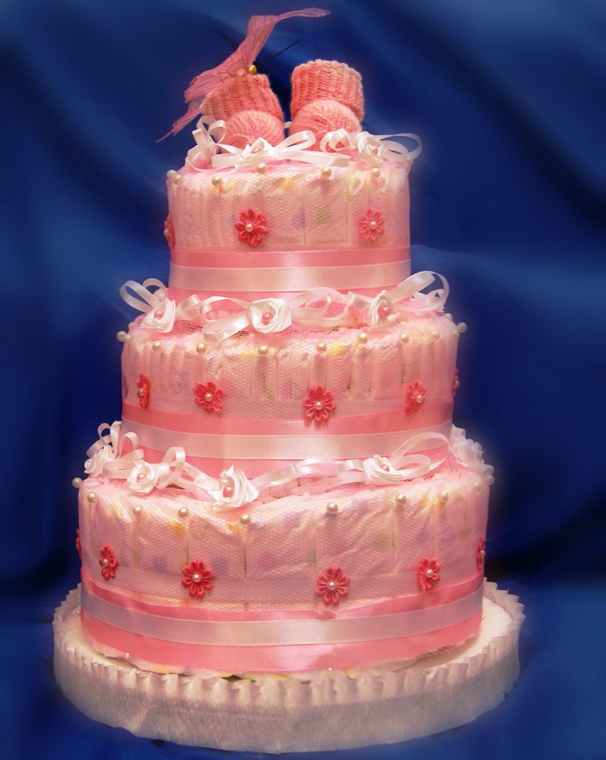 Un gâteau de couches original pour un garçon ou une fille peut être réalisé si vous achetez à l'avance les couches avec de jolis motifs. Le tissu est utilisé pour recouvrir complètement les étages du gâteau, chacun d'entre eux étant recouvert séparément, et des roses faites de moufles, de papier ou même d'argent sont utilisées pour la décoration.