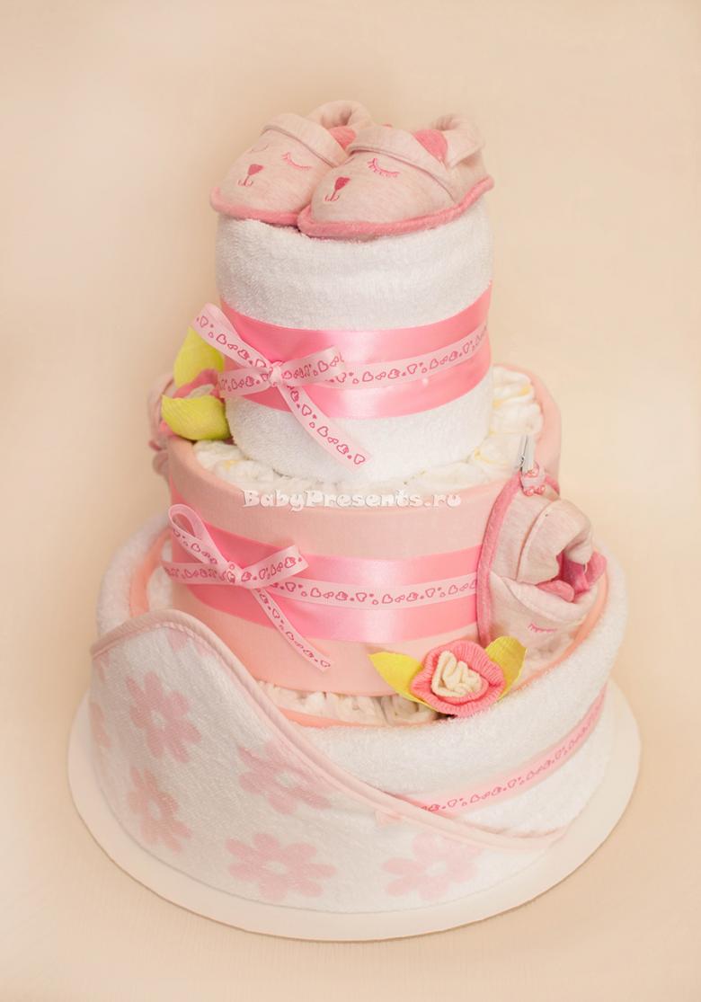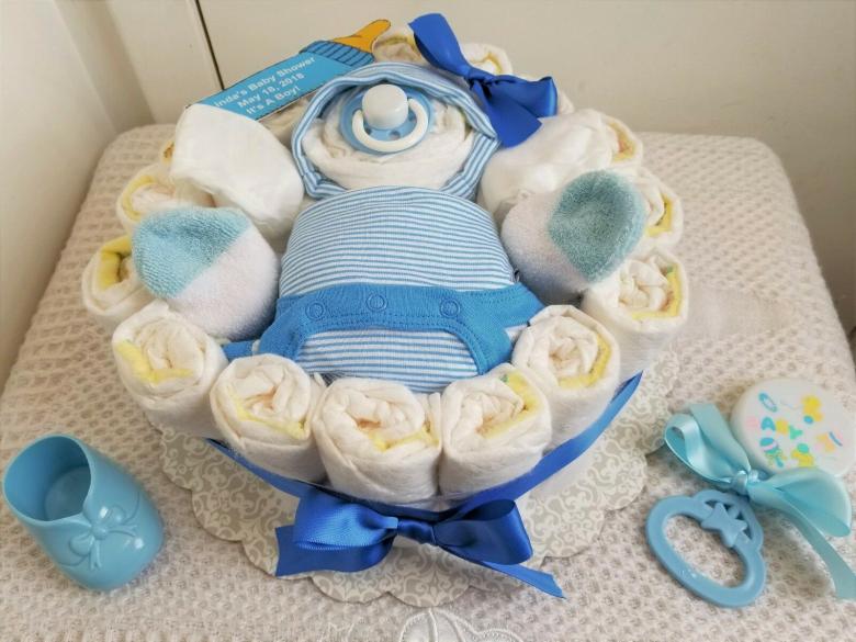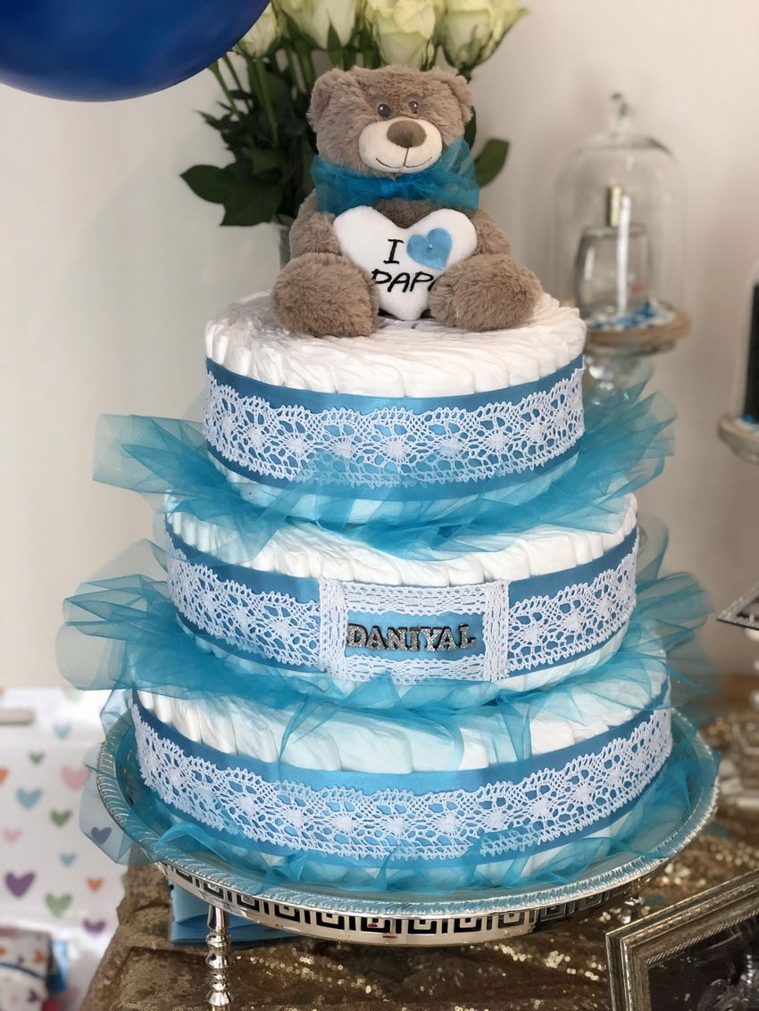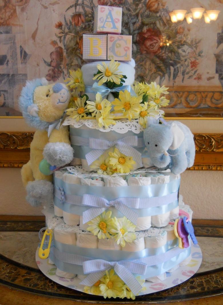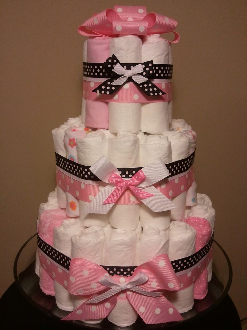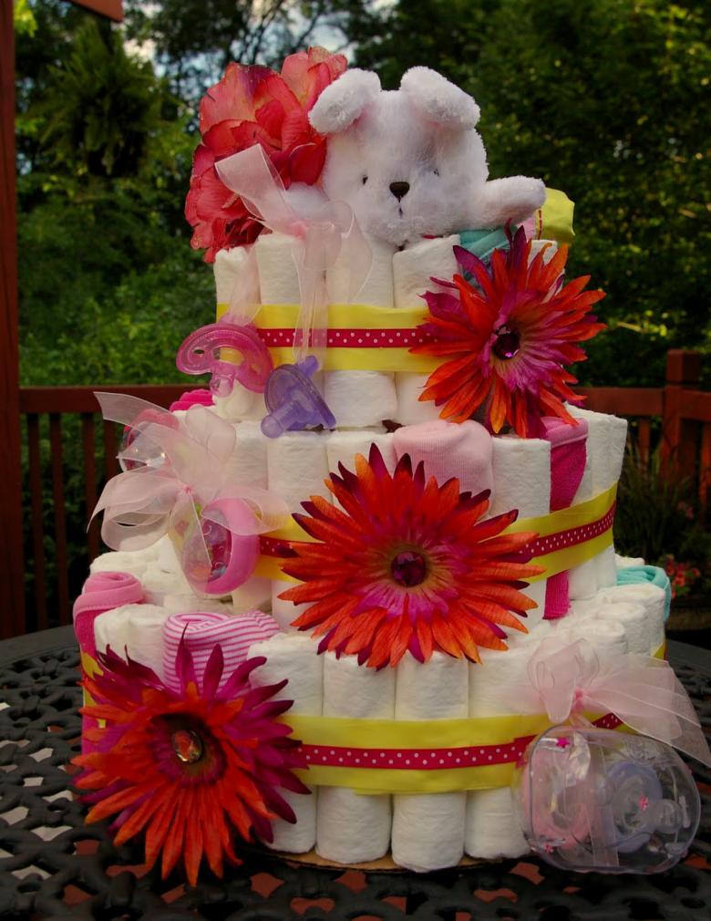Un gâteau de couches original pour un garçon ou une fille peut être réalisé si vous achetez à l'avance les couches avec de jolis motifs. Le tissu est utilisé pour recouvrir complètement les étages du gâteau, chacun d'entre eux étant recouvert séparément, et des roses faites de moufles, de papier ou même d'argent sont utilisées pour la décoration.