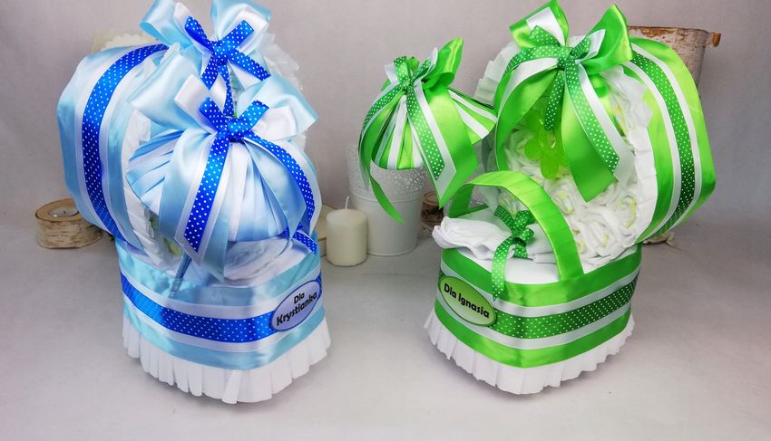 La technique de décoration de gâteaux nus utilisée en cuisine est idéale pour décorer des cadeaux pour le bébé et ses parents. Il n'est pas nécessaire de décorer des étages individuels pour ces articles, un ruban large et étroit de différentes couleurs ou nuances qui fixera les couches torsadées est suffisant.