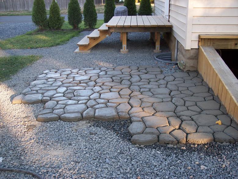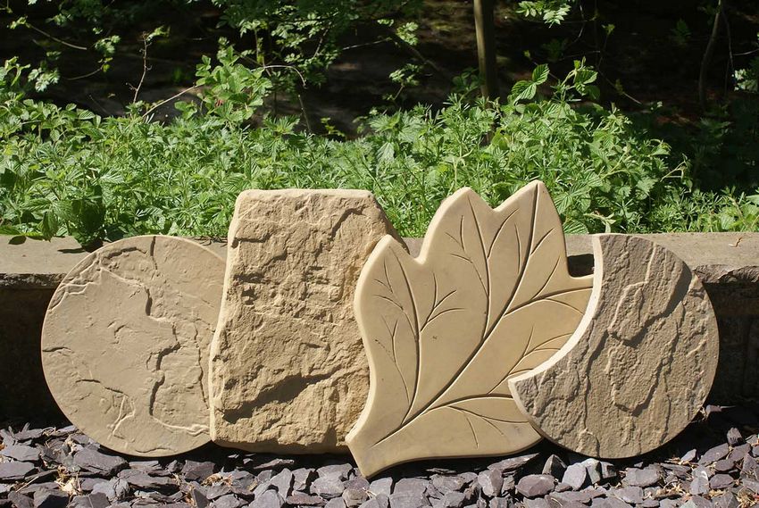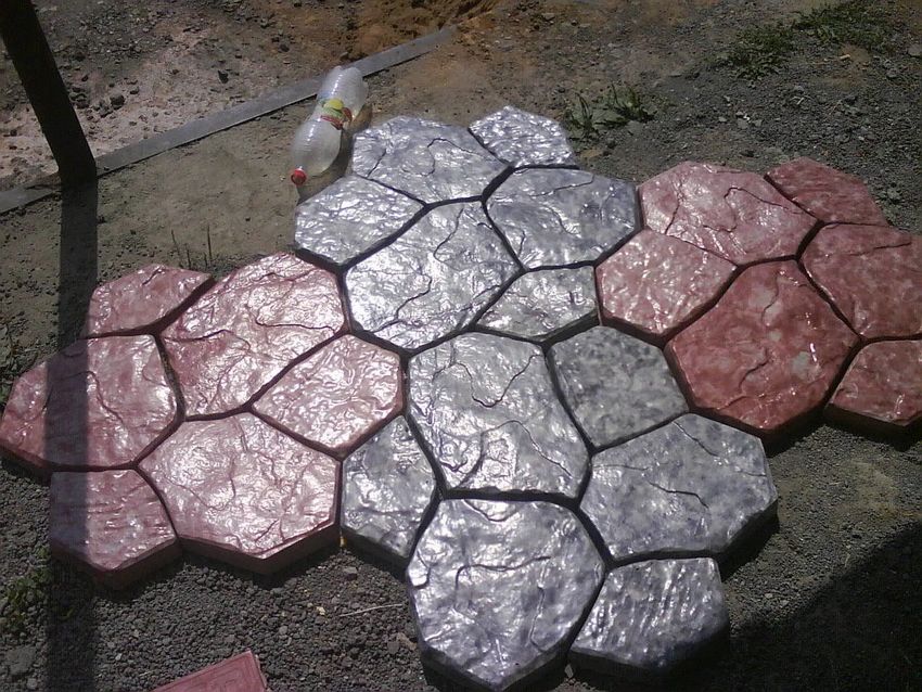 Il existe de nombreux exemples où les jardiniers, ne voulant pas s'embêter avec la fabrication de formes en bois, ont utilisé pour verser le mélange des récipients en plastique ordinaires, donnant à la surface de travail du relief original avec des feuilles mortes, des couleurs différentes.