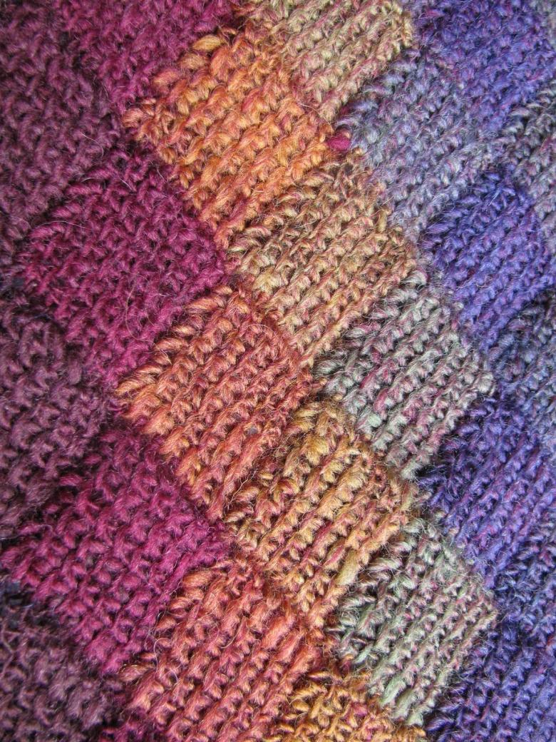 Ce style de tricot tunisien diffère des deux précédents par la façon dont les mailles du rang précédent sont saisies. La colonne est saisie de gauche à droite au lieu de droite à gauche, en tordant la boucle et en tirant le fil à travers. Le rang est complété, puis fermé avec un crochet.