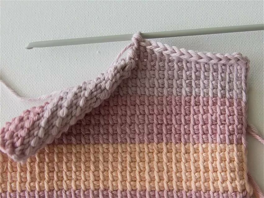 Le tissu tunisien est tricoté sur l'avant. Rentrez les points de gauche à droite, relâchez les points dans l'autre sens et refermez de gauche à droite. Le produit n'est pas retourné. Pour plus de commodité, le long crochet est tenu comme une aiguille.