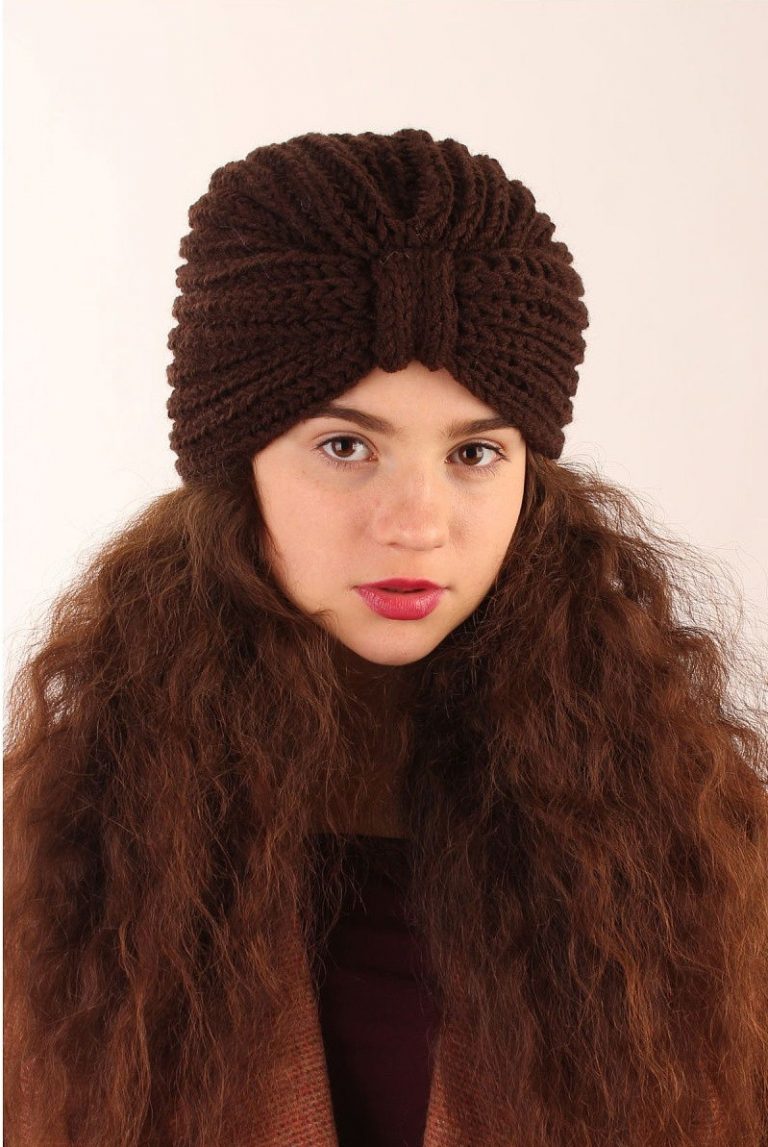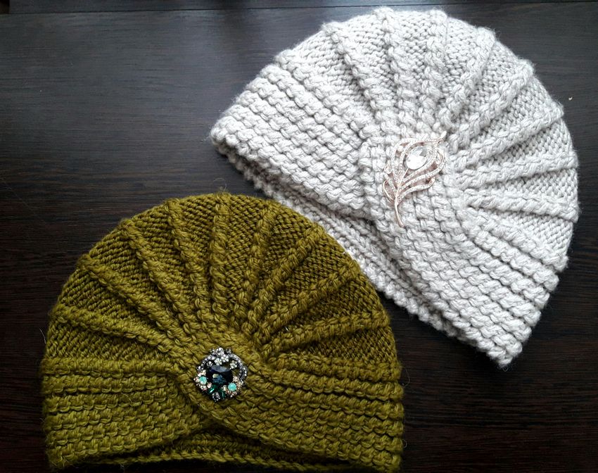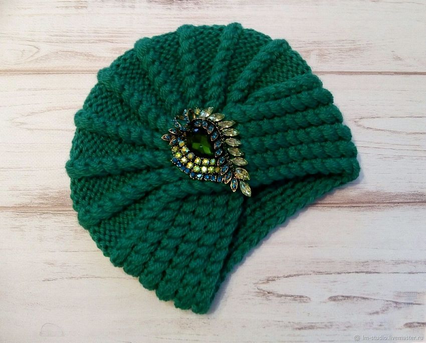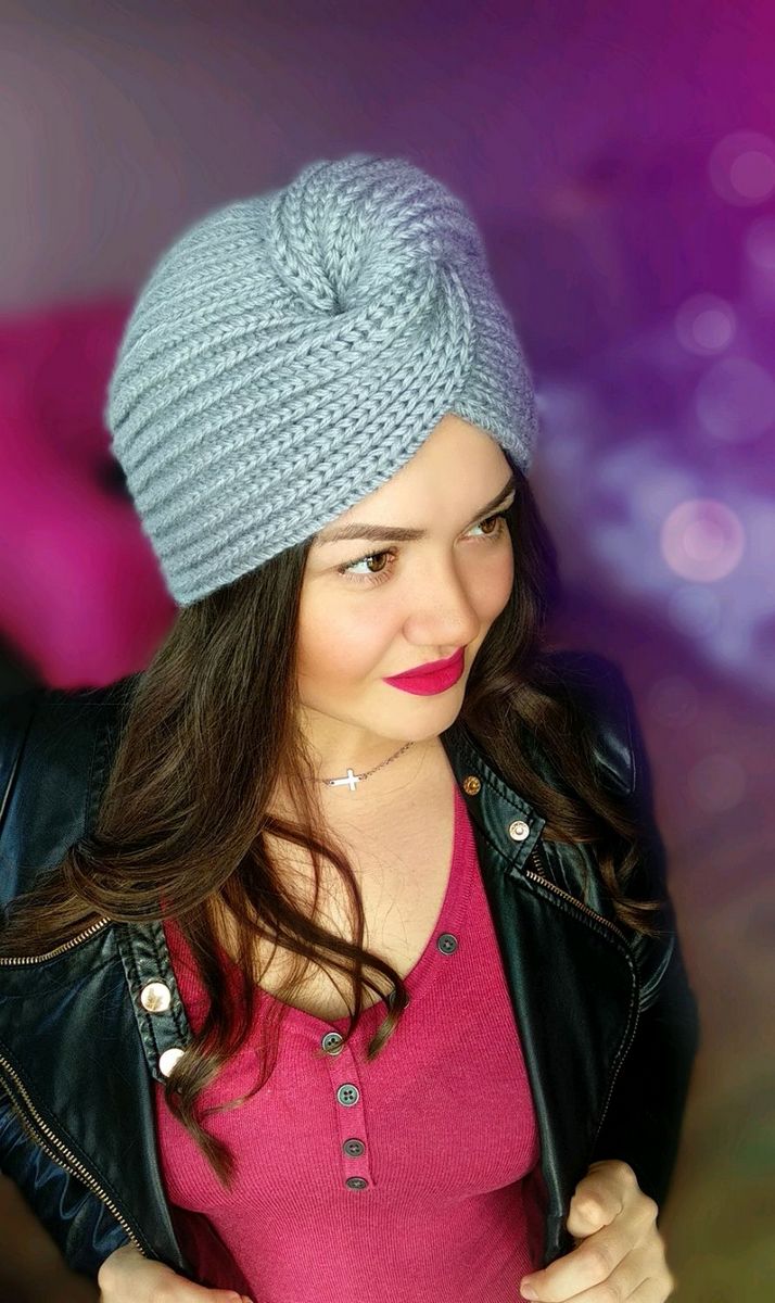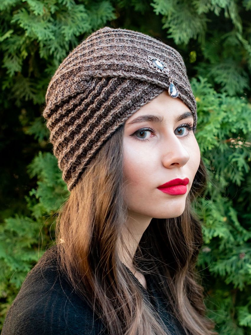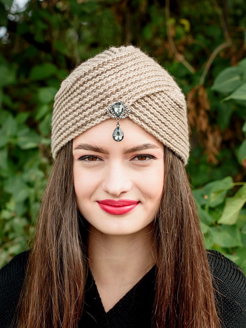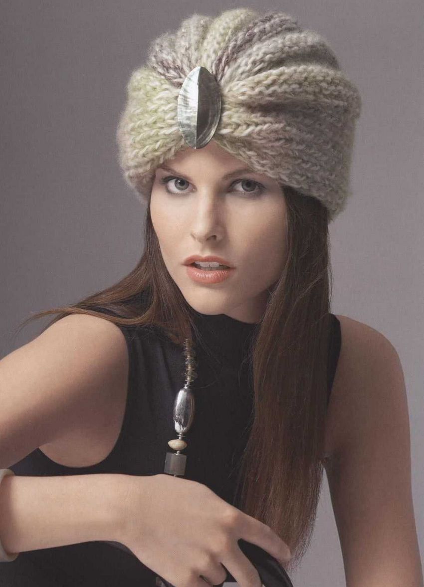 L'option la plus simple, adaptée aux tricoteurs inexpérimentés, est le turban, qui est un large bandeau tricoté orné à l'avant d'un élément décoratif qui le tire simultanément vers le haut pour créer un effet de nœud spécifique.