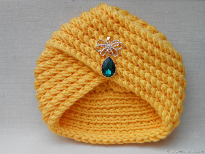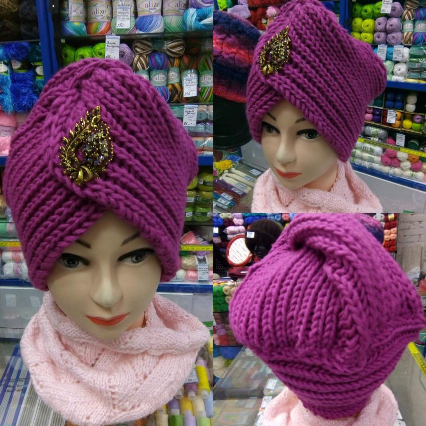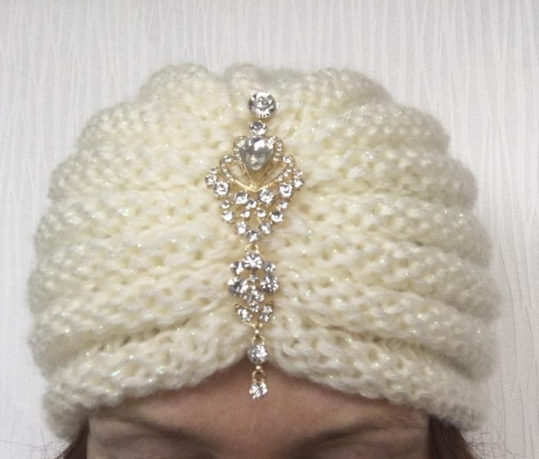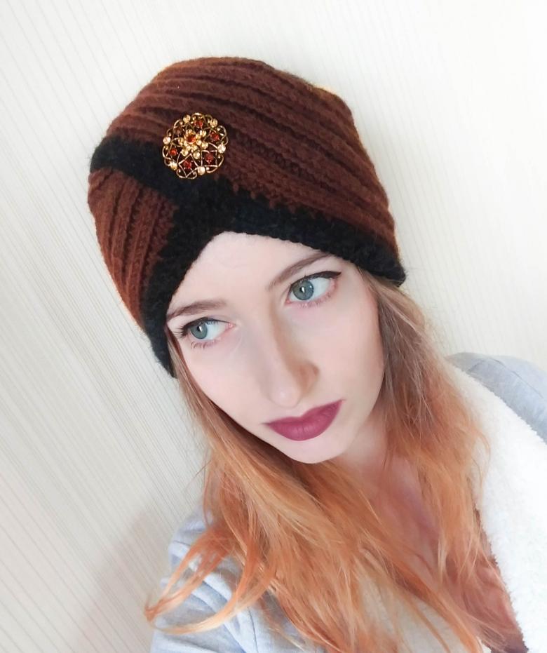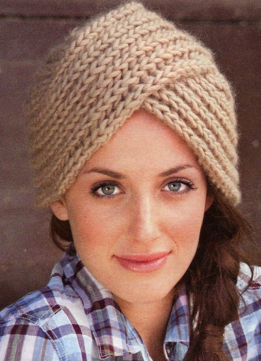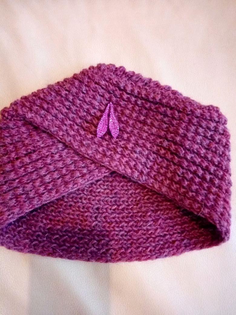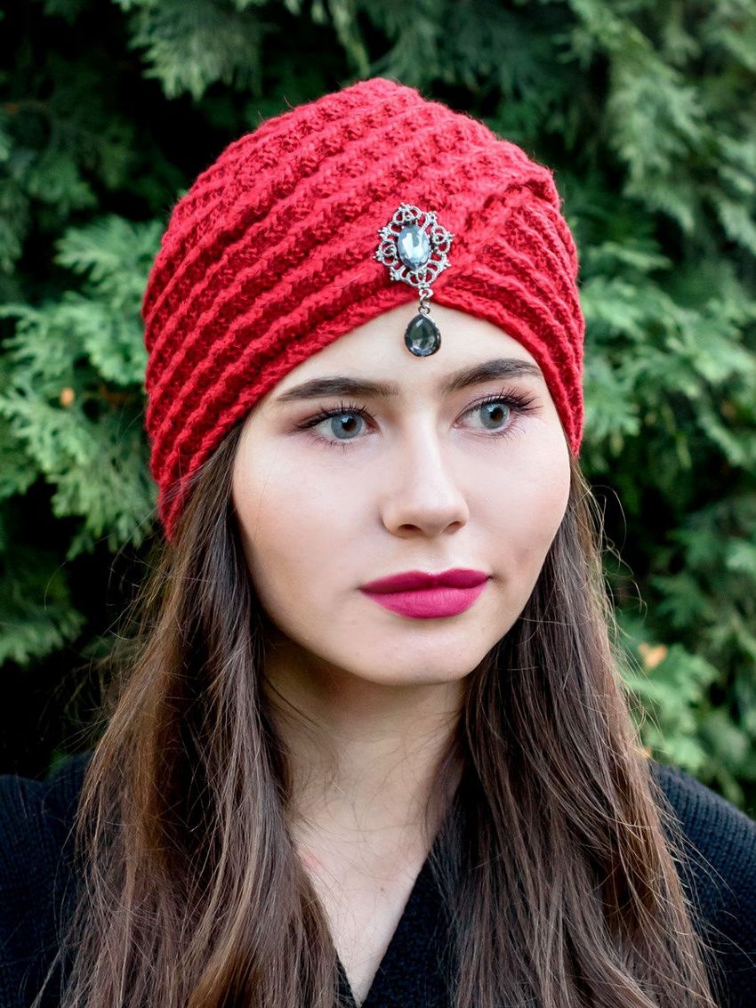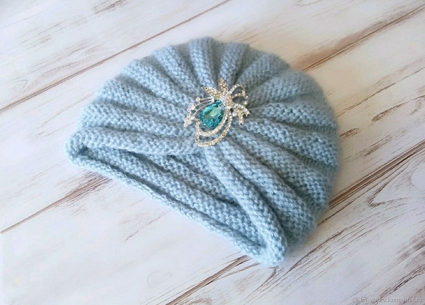 L'option la plus simple, adaptée aux tricoteurs inexpérimentés, est le turban, qui est un large bandeau tricoté orné à l'avant d'un élément décoratif qui le tire simultanément vers le haut pour créer un effet de nœud spécifique.