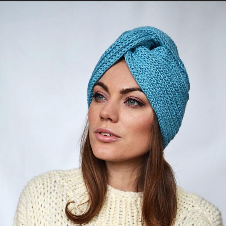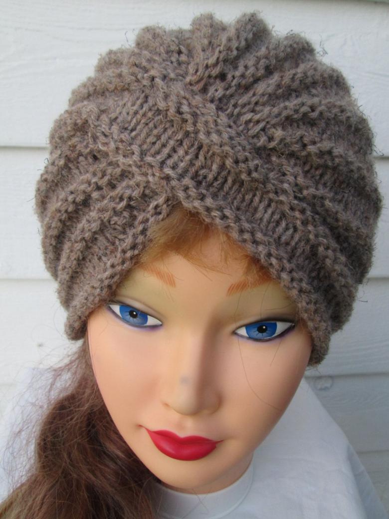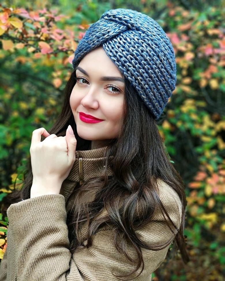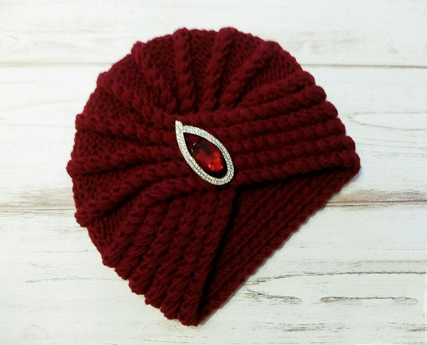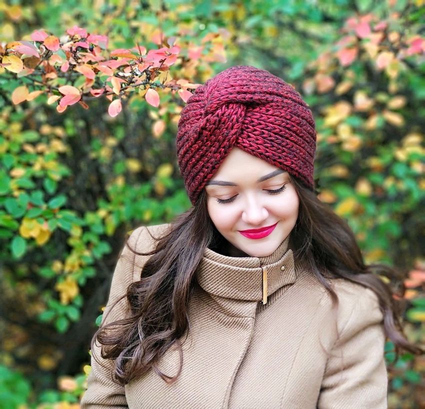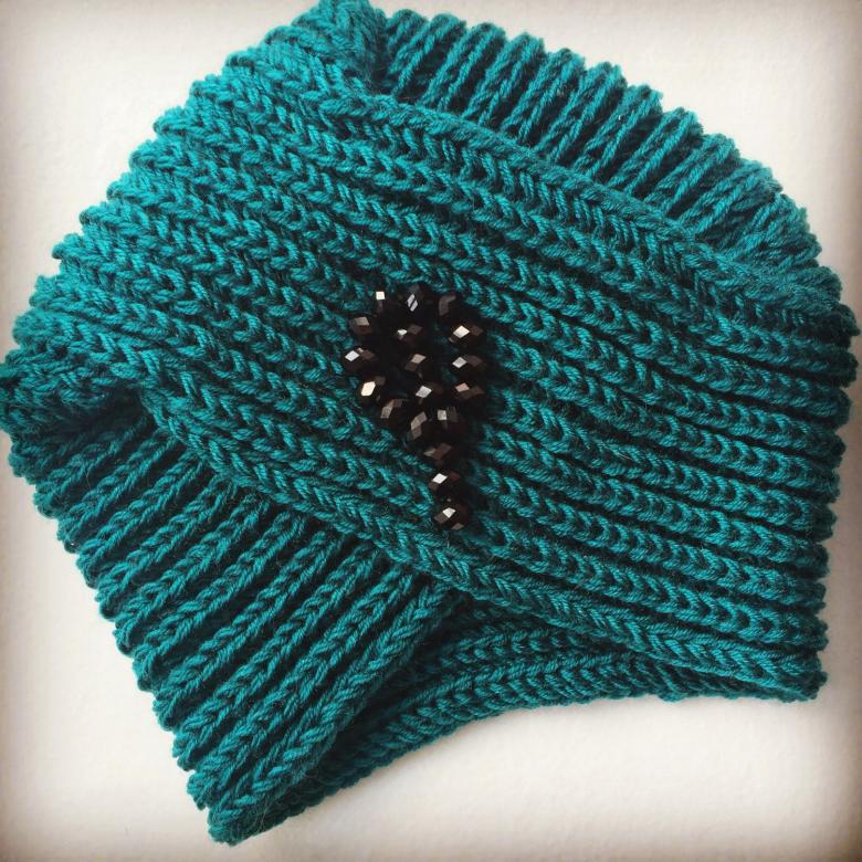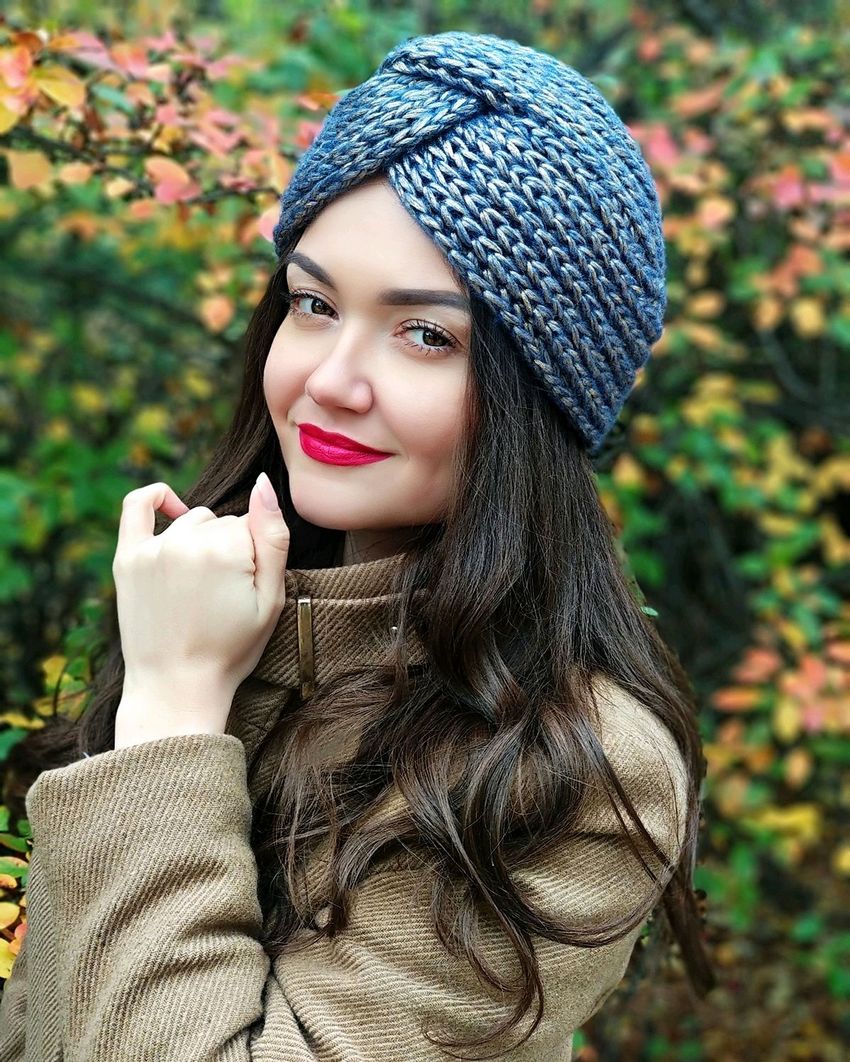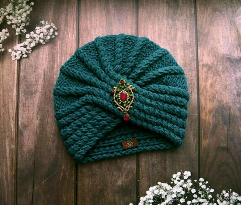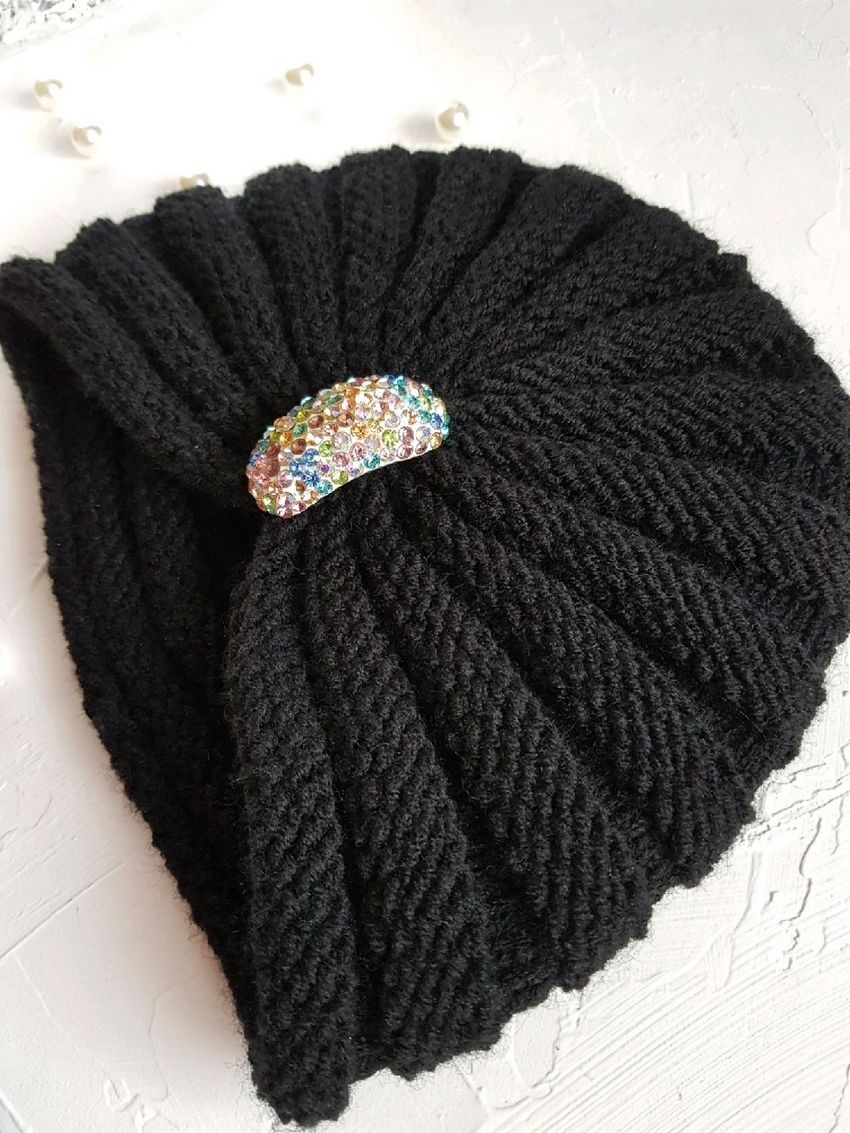 L'option la plus simple, adaptée aux tricoteurs inexpérimentés, est le turban, qui est un large bandeau tricoté orné à l'avant d'un élément décoratif qui le tire simultanément vers le haut pour créer un effet de nœud spécifique.