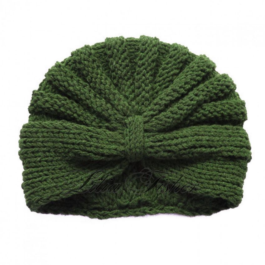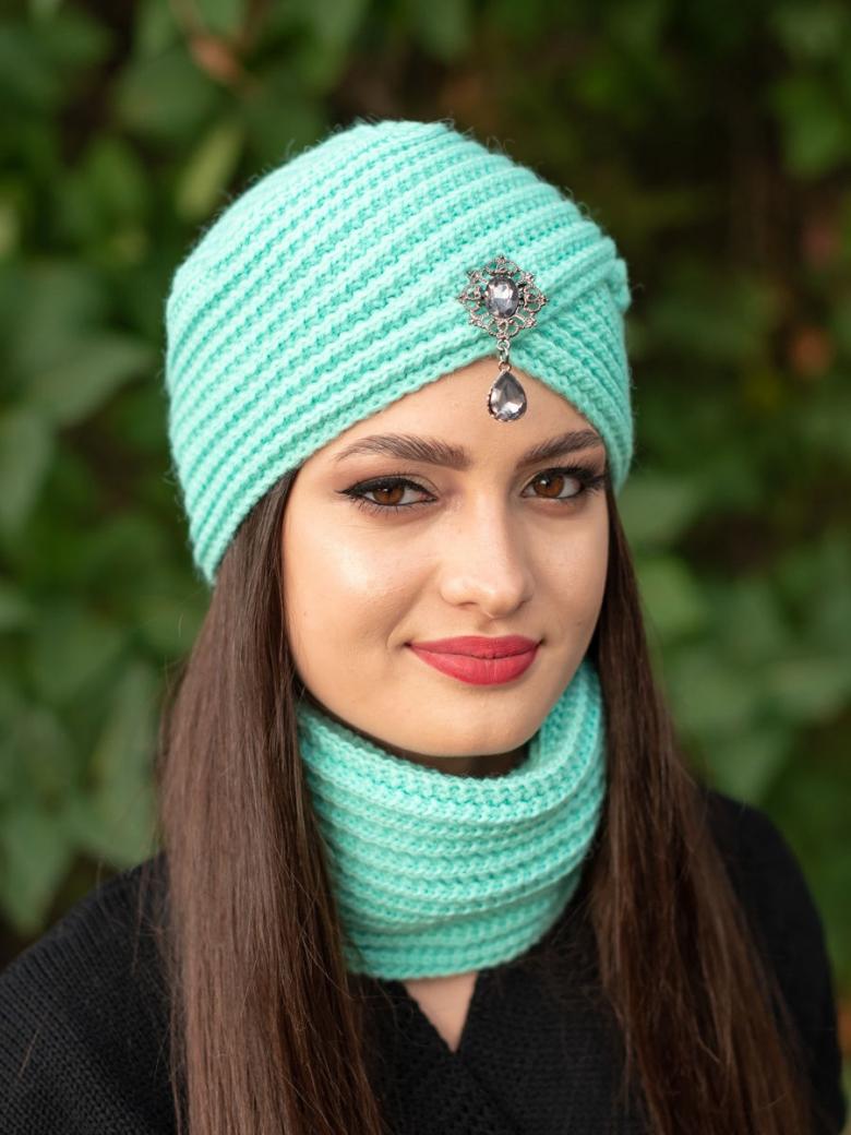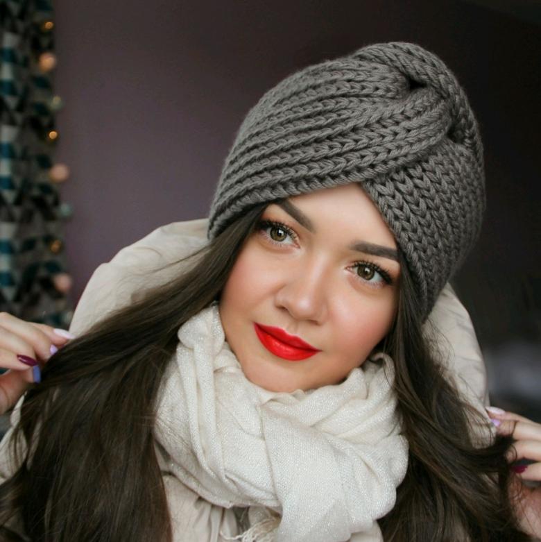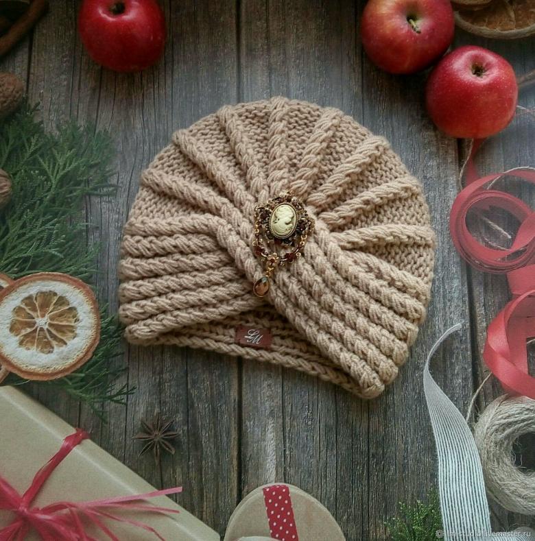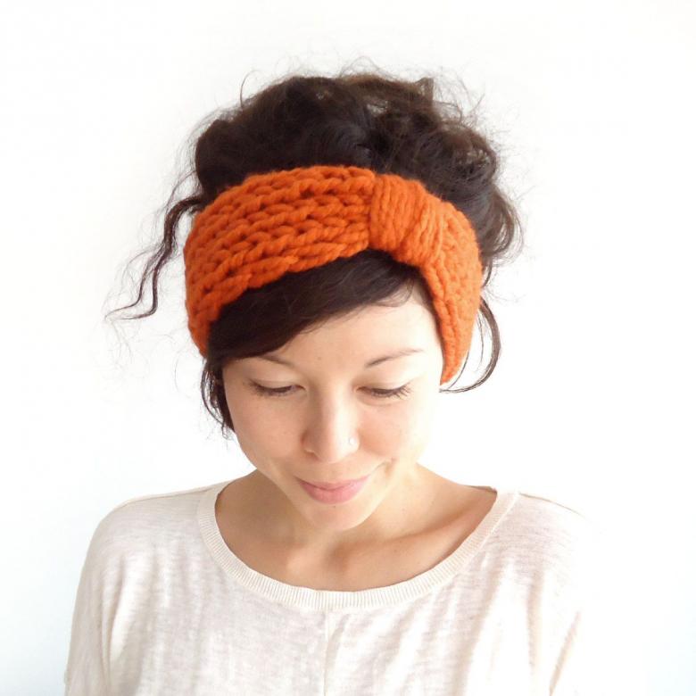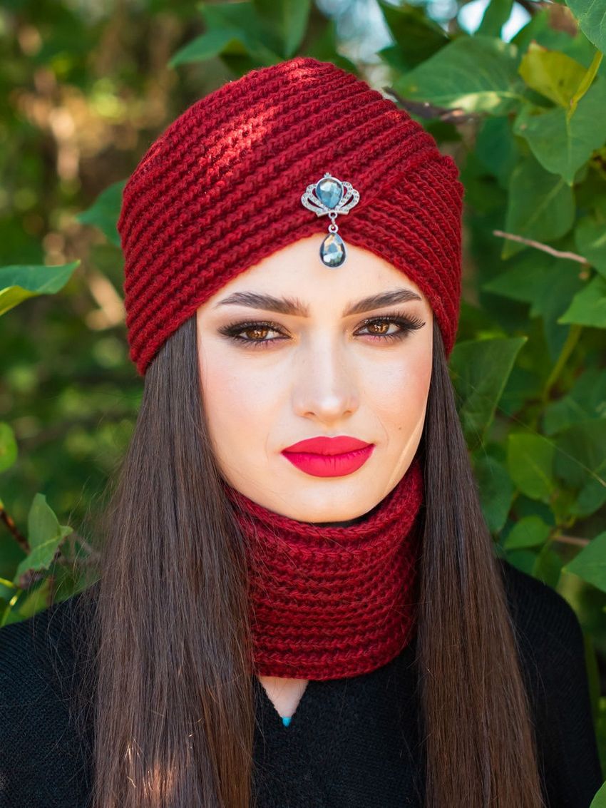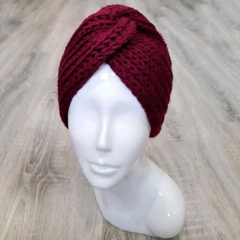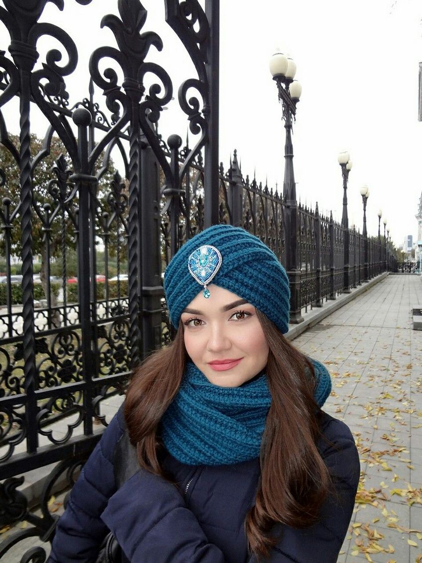 L'option la plus simple, adaptée aux tricoteurs inexpérimentés, est le turban, qui est un large bandeau tricoté orné à l'avant d'un élément décoratif qui le tire simultanément vers le haut pour créer un effet de nœud spécifique.