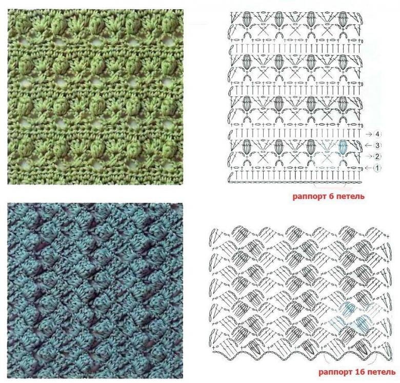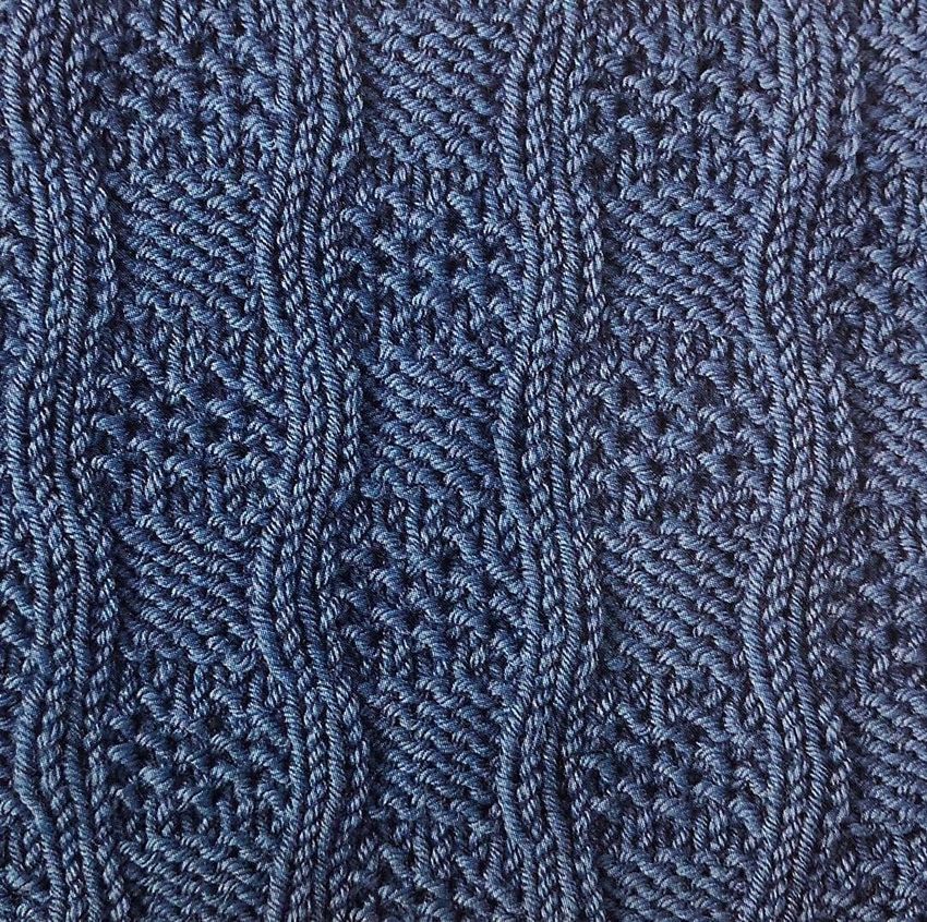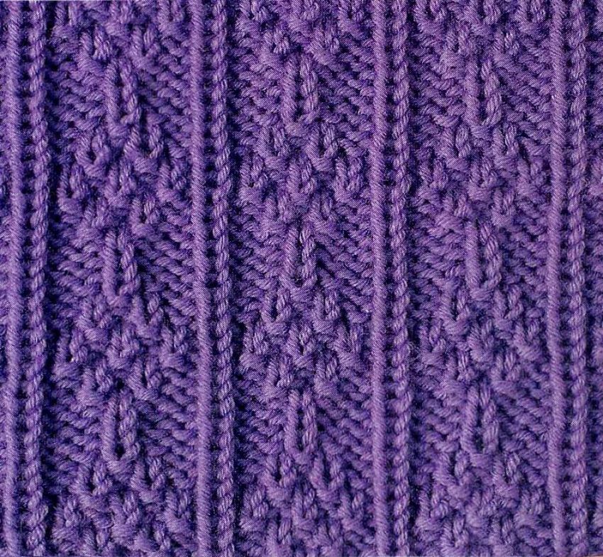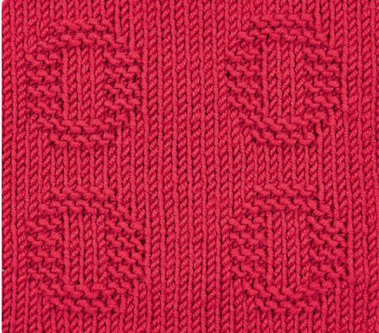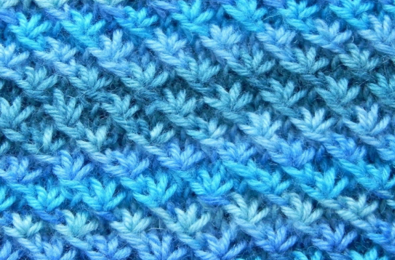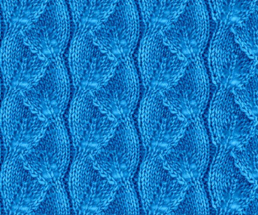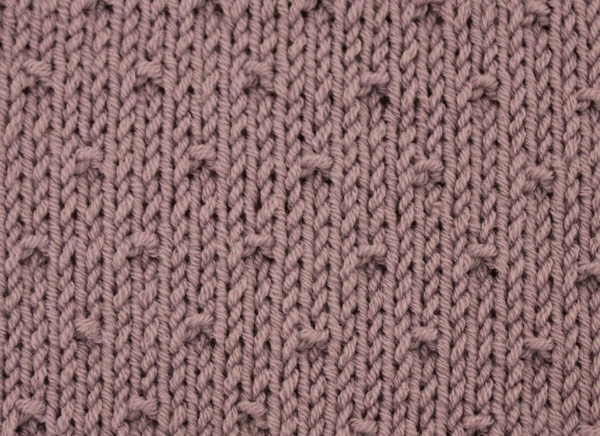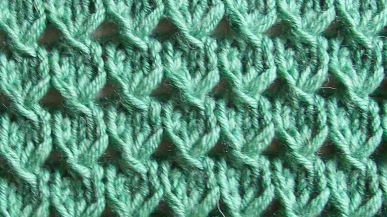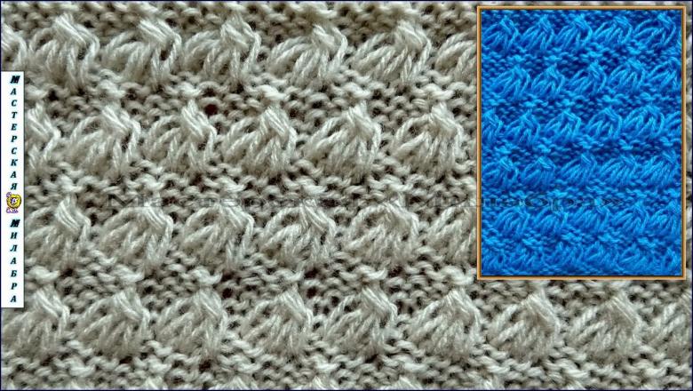 Un patron double face, utilisé pour tricoter des bonnets, des écharpes et des manteaux. Le motif comporte quatre boucles, et a une hauteur de 4 rangs. La première bande se fait en alternant l'endroit et l'envers. Au deuxième rang, les boucles lisses sont tricotées sur le visage, les boucles fausses sont enlevées avec une charnière.