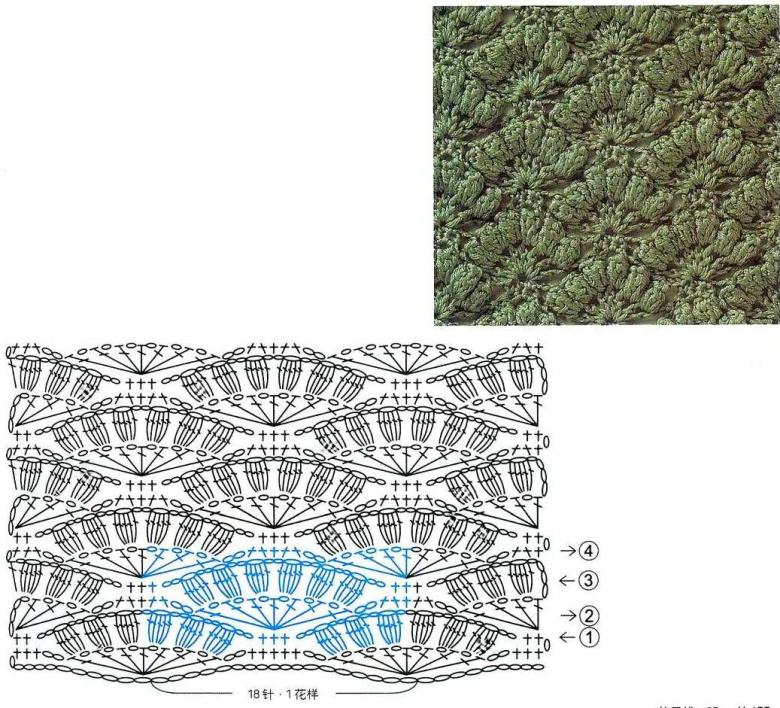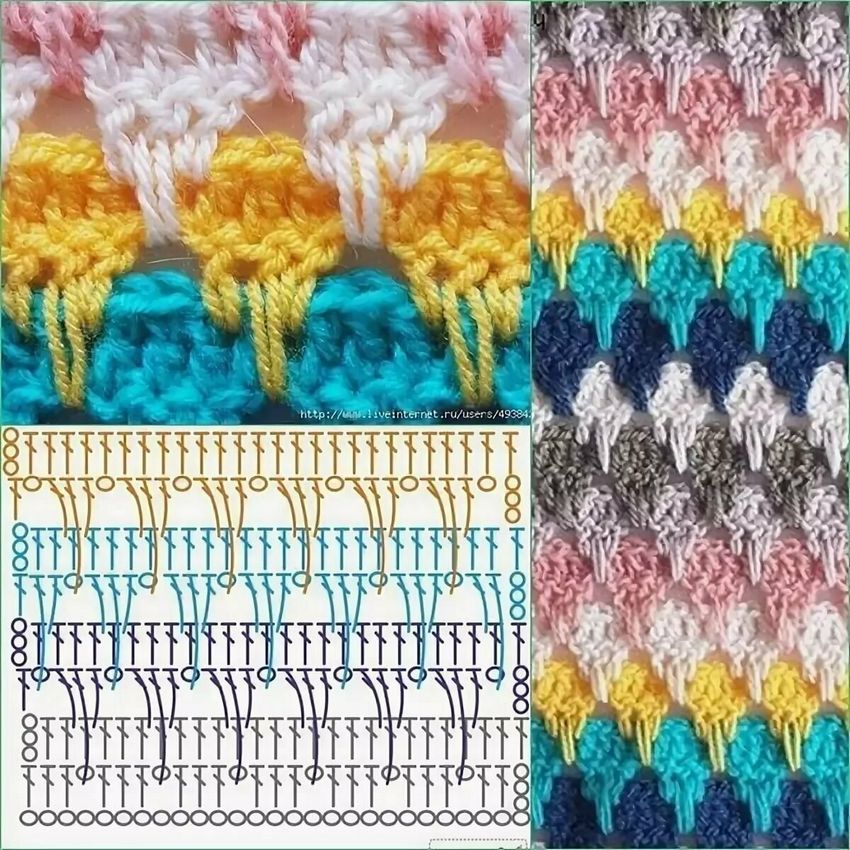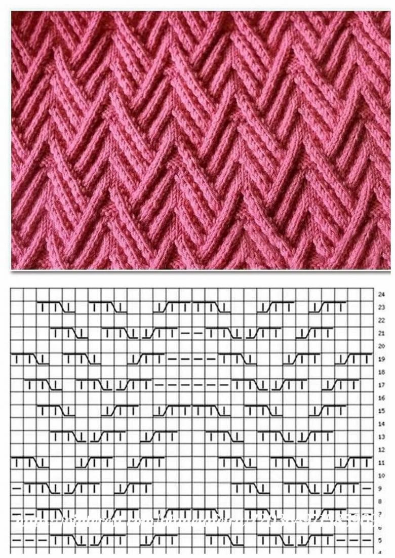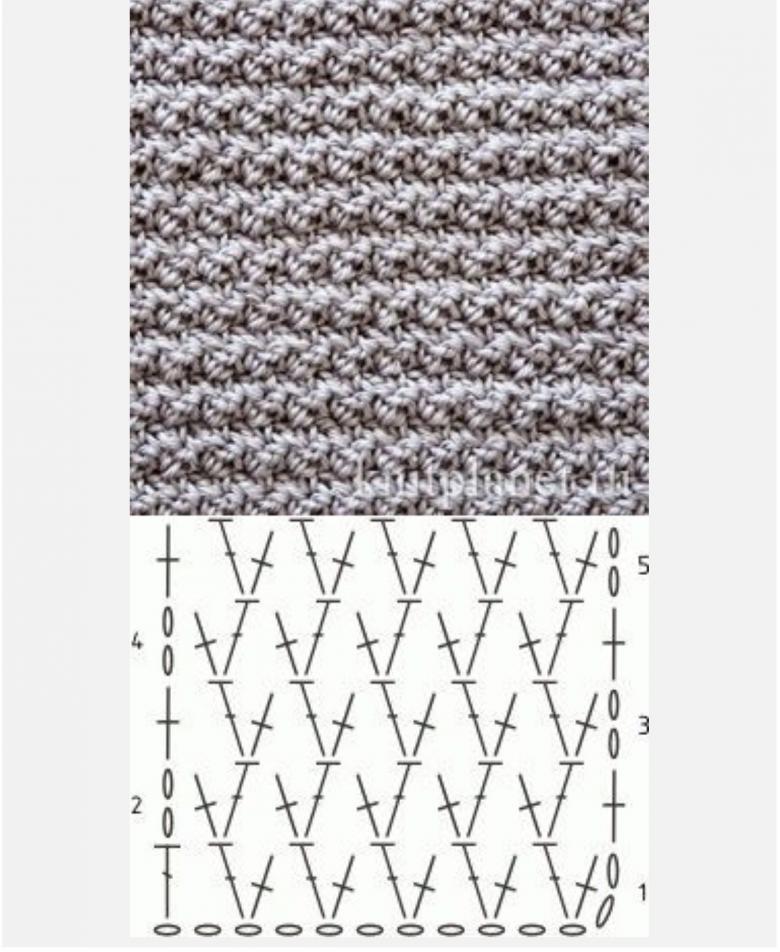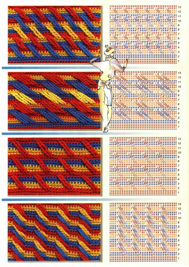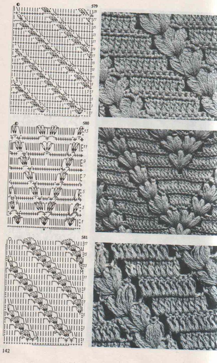 Un patron double face, utilisé pour tricoter des bonnets, des écharpes et des manteaux. Le motif comporte quatre boucles, et a une hauteur de 4 rangs. La première bande se fait en alternant l'endroit et l'envers. Au deuxième rang, les boucles lisses sont tricotées sur le visage, les boucles fausses sont enlevées avec une charnière.