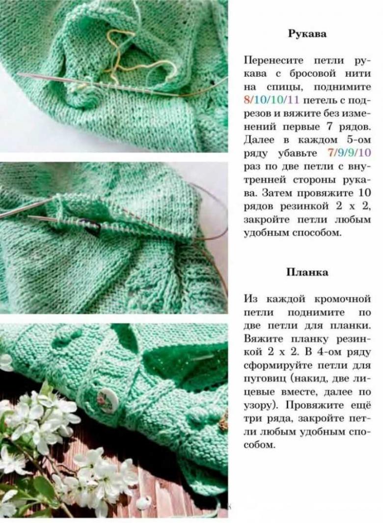 Les manches sont tricotées sur des aiguilles circulaires séparées. Pour rétrécir les manches, coupez tous les 5-6 rangs. La manche peut être terminée par un élastique.