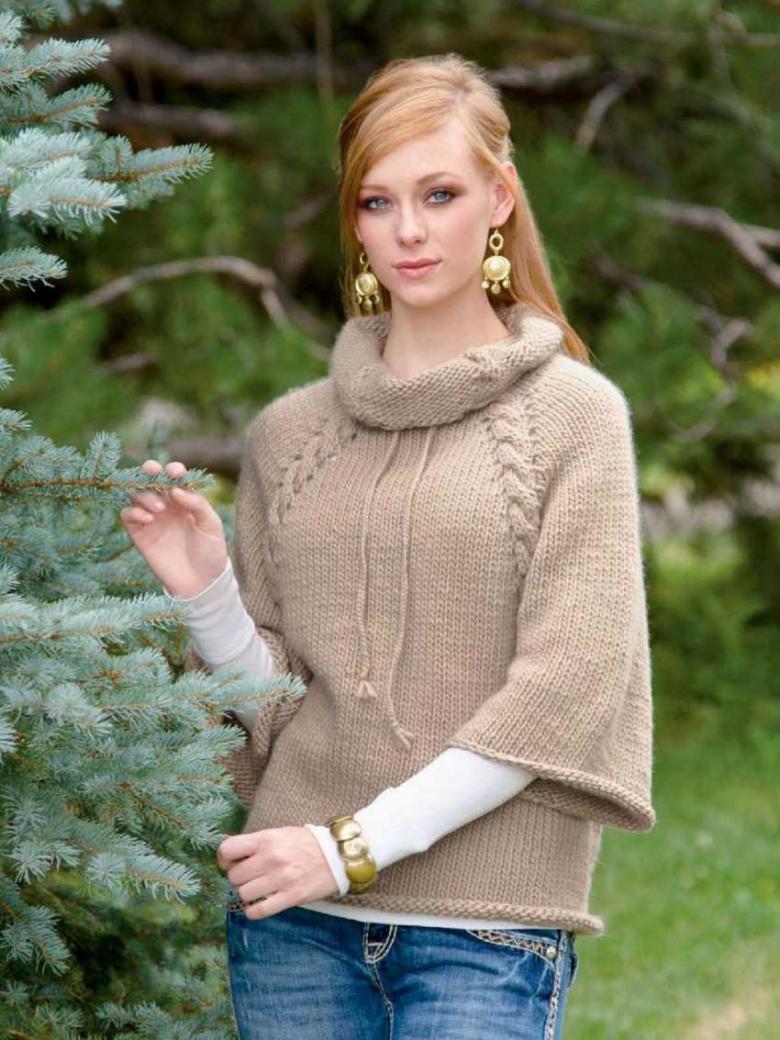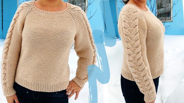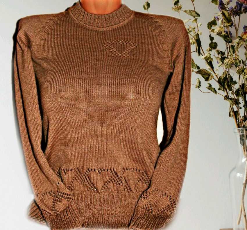 Lorsque vous tricotez le corps du pull-over selon un motif circulaire, n'augmentez pas le nombre de boucles, mais tricotez en rangs droits jusqu'à la longueur requise. Pour les manches, il est également plus facile d'utiliser des aiguilles circulaires. Pour rétrécir les manches, ajoutez des mailles tous les 6 rangs. Reste à nouer le col et le pull est prêt.
