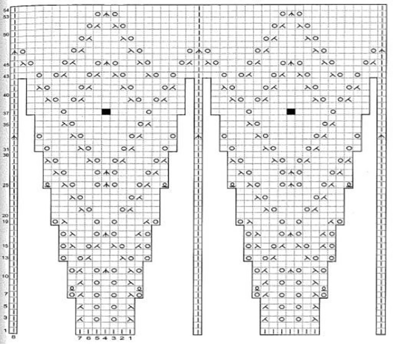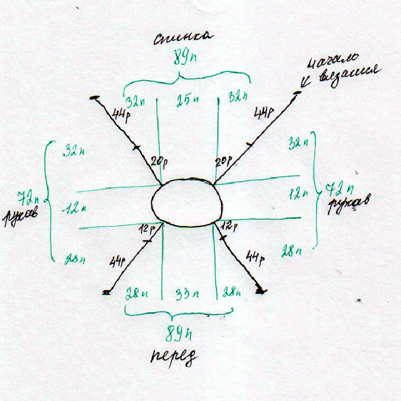 Le nombre approximatif de points pour un col de 35 cm est le suivant : pour le dos 26, pour la manche 9 et pour le devant 27. Si vous avez une taille particulière, calculez le bon nombre de boucles juste pour votre pull, ces calculs serviront de base pour tricoter l'ensemble de la pièce.