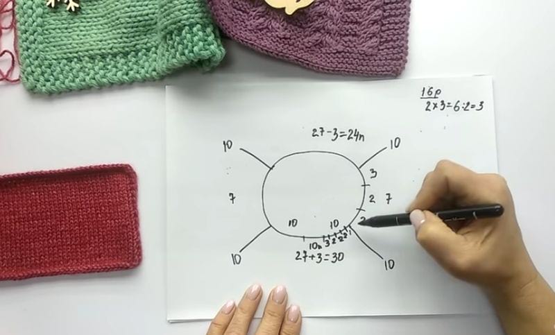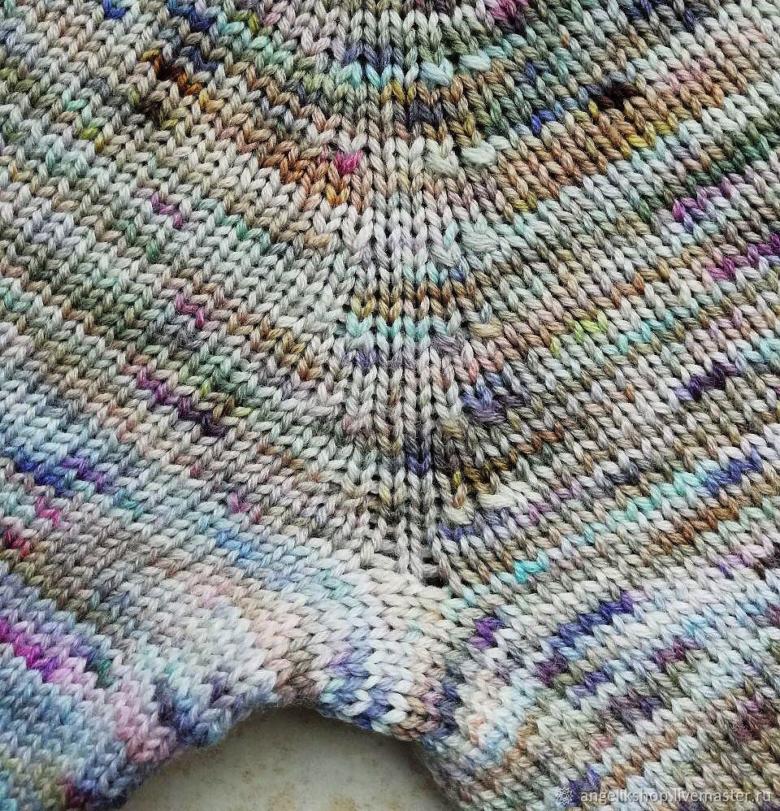 Aussi, après 1 rang, faites des ajouts le long de la ligne du raglan, jusqu'à ce que nous ayons le bon nombre de boucles sur le devant - dans notre cas, cela devrait être 27. Vous pouvez maintenant joindre le tricot en cercle et passer aux aiguilles circulaires. Continuez à ajouter des points à chaque rang le long de la ligne raglan.