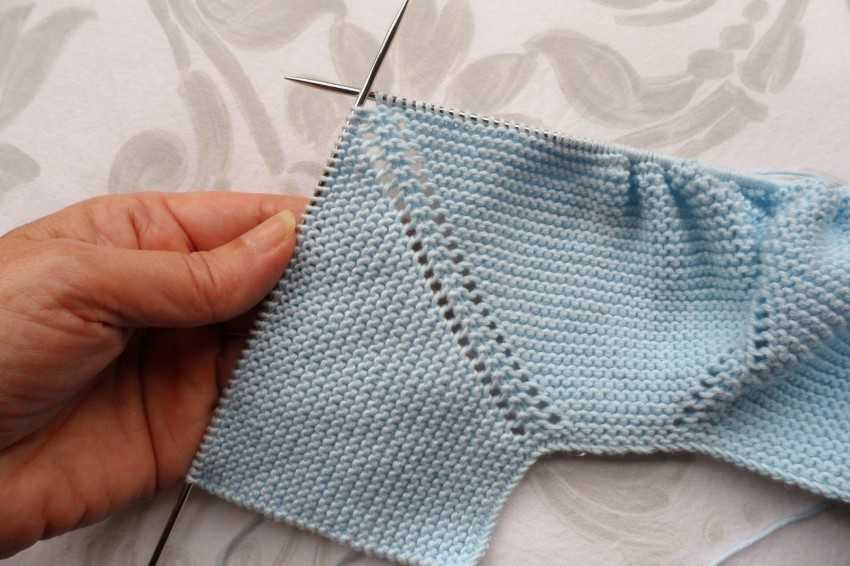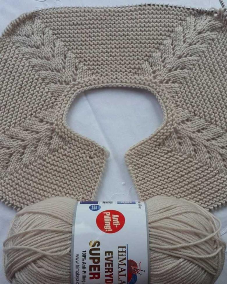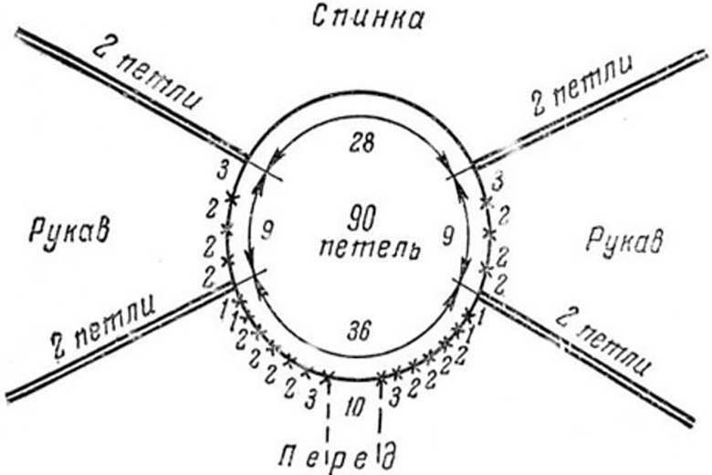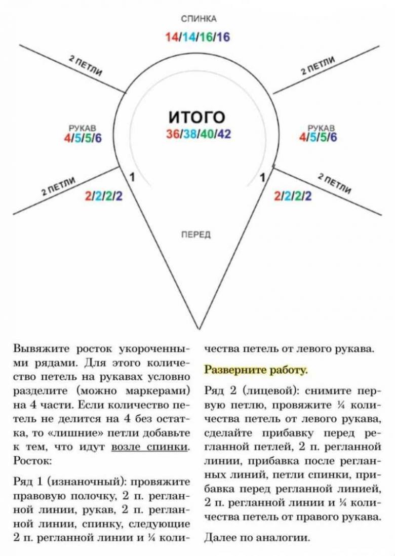 Ensuite, tricotez le tissu, dans chacun des rangs de l'endroit, faites des ajouts de part et d'autre de la ligne raglan. Pour le motif de la ligne raglan, vous pouvez faire des points de croix dans chaque rangée où nous faisons un ajout.