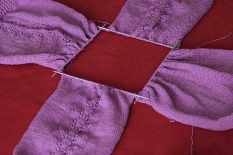 Lorsque le raglan est noué, joignez le dos et les côtés du cardigan et ajoutez 15 mailles pour les manches, en les divisant en 2 parties - au début et à la fin du rang. Ensuite, tricotez le cardigan selon un motif circulaire.