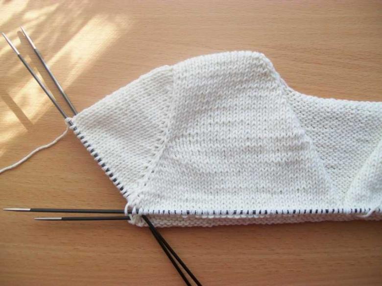 Lorsque les lignes du raglan sont suffisamment attachées, le devant et le dos doivent se rejoindre. Maintenant, enlevez les points pour les manches sur des rayons séparés. Le raglan est prêt.