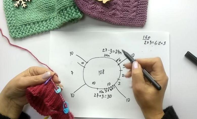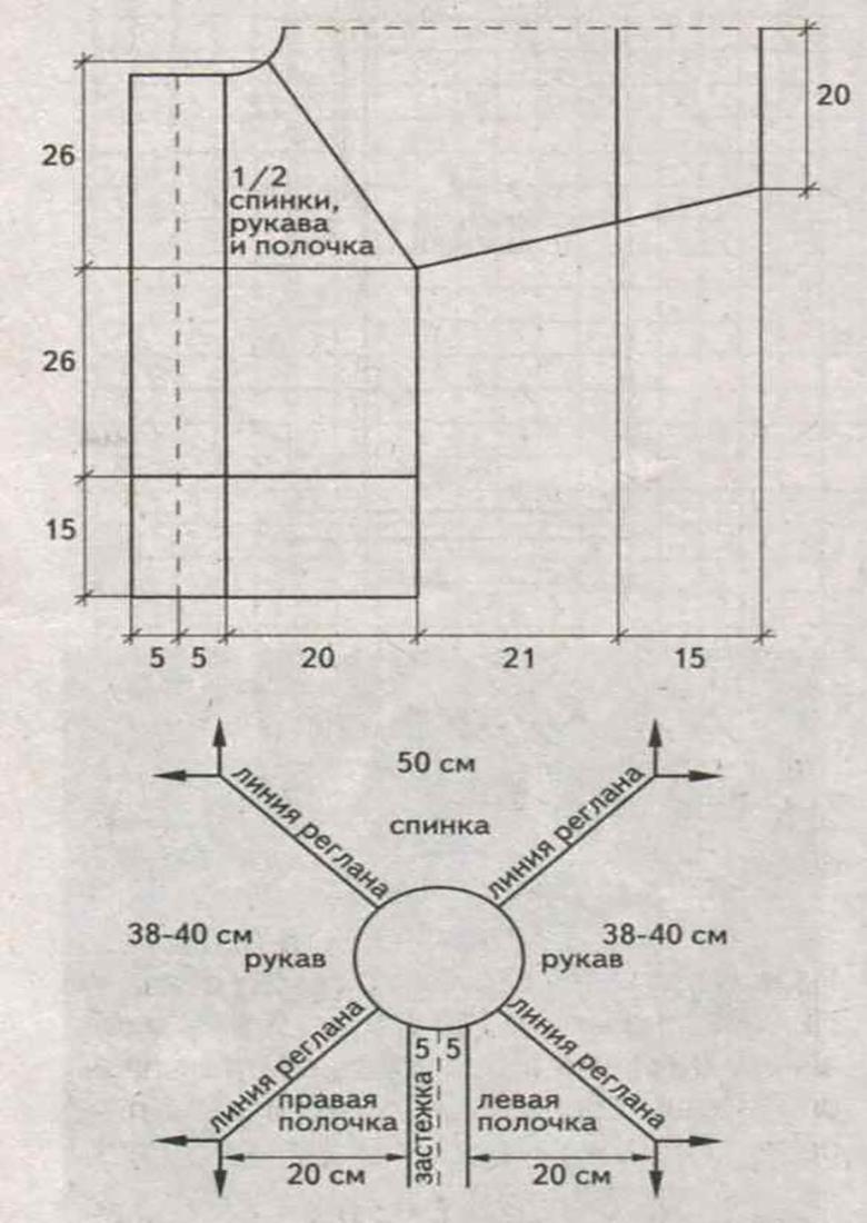 Le cardigan sera tricoté au conditionnel des 5 parties : 2 rayons, dos et 2 manches. Composez un nombre de boucles en fonction de la taille requise. Par exemple, pour la taille 56, le calcul est le suivant : 18 points pour les manches, pour chaque tablette 24 boucles pour le dos 34 boucles et 8 boucles pour les lignes raglan.