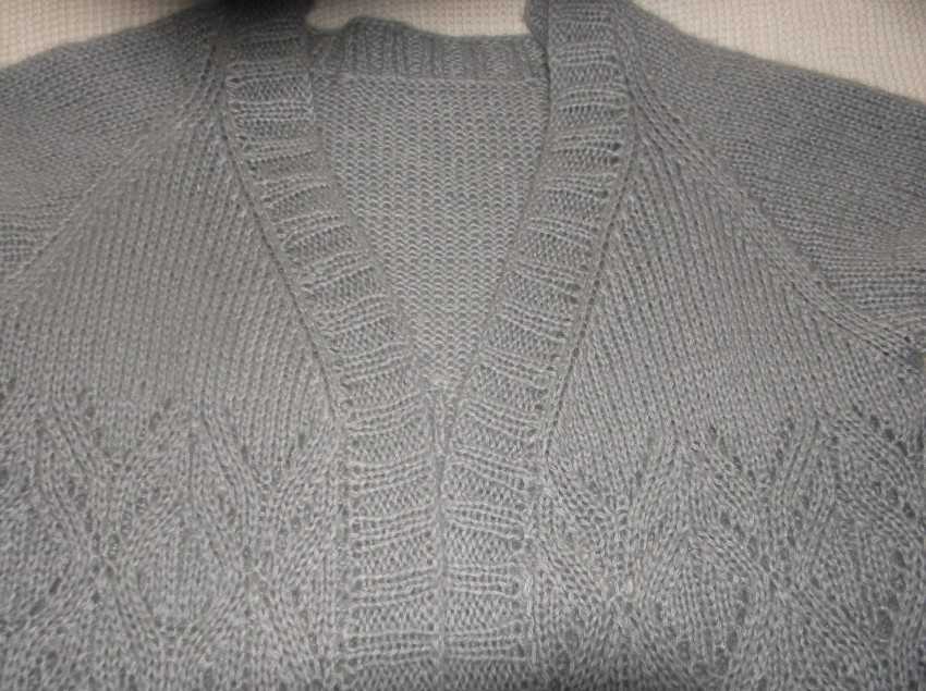 Si vous devez élargir le tissu, utilisez la méthode consistant à ajouter des points à partir de l'endroit de chaque 10 points dans une rangée, tous les 5-8 cm. En d'autres termes, il suffit de tricoter deux mailles à partir d'une seule maille. Cela suffira pour élargir les points de suture environ 5-8 fois. Terminez toute la longueur du cardigan.