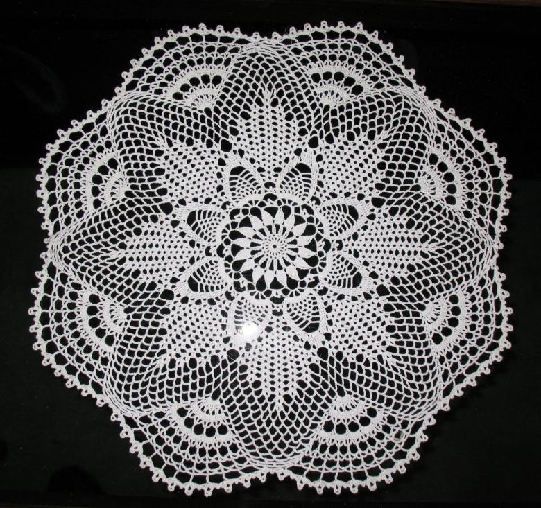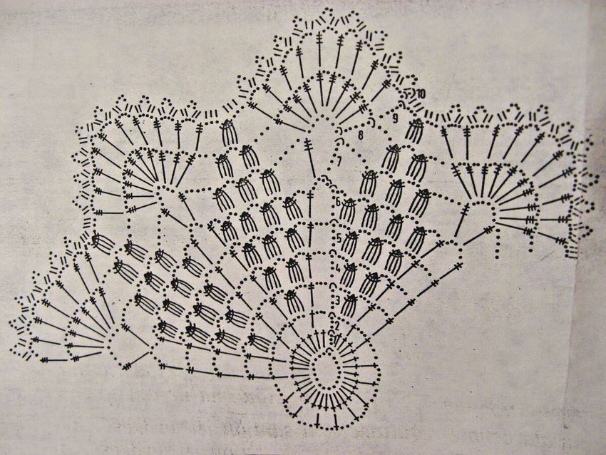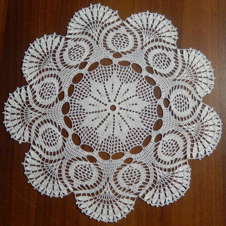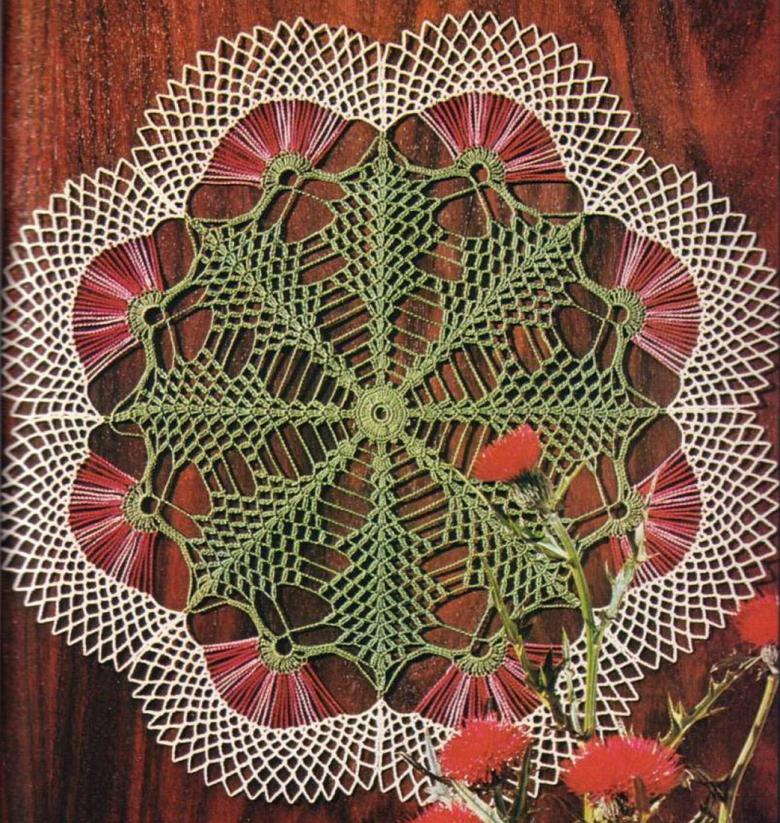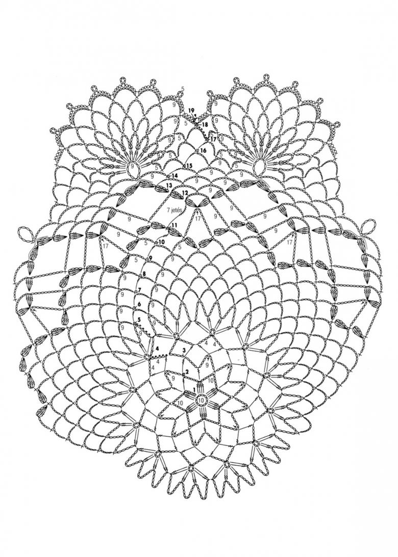- Le septième rang commence par 5 v. p. Les points sont au nombre de 15, ils sont cousus à travers les boucles d'air du rang précédent. Le motif de l'anneau est répété.