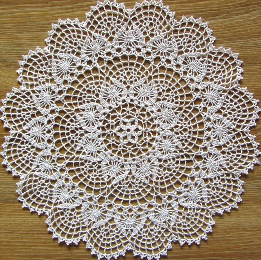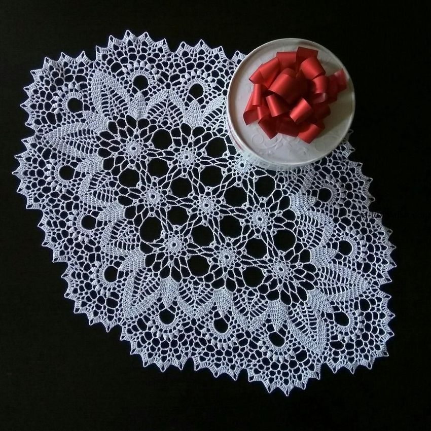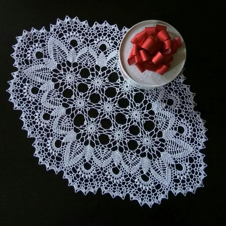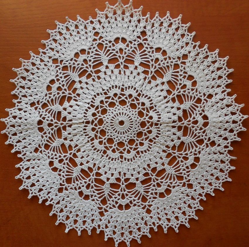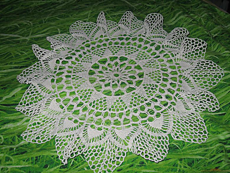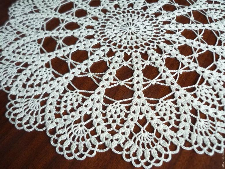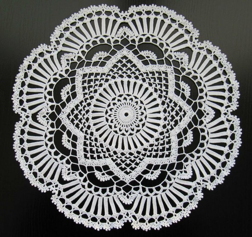 Cette belle dentelle blanche comme la neige, d'un diamètre de 48 cm, est tricotée avec 325 m / 50 g de fil de coton et un crochet de 1 - 1,25 g.