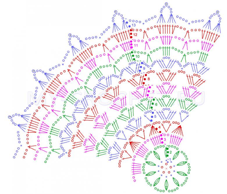 - Continuez à crocheter le motif en rond selon le schéma, en commençant chaque niveau par des boucles d'air, et en terminant par un poste de liaison.