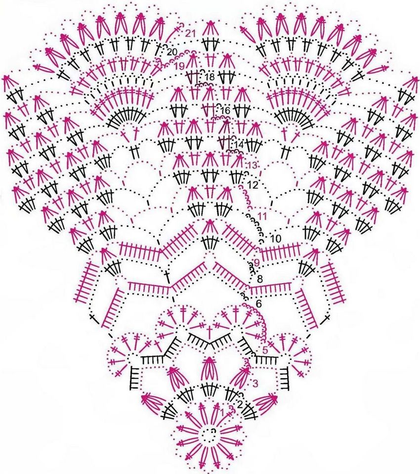 - Continuez à tricoter selon le schéma, en commençant chaque niveau par une boucle d'air et en terminant par une colonne de liaison.
