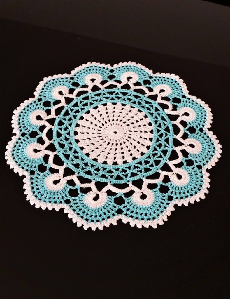 - Le tour suivant répète le tour précédent, en augmentant de deux le nombre de mailles doubles du motif et d'une le nombre de boucles d'air.