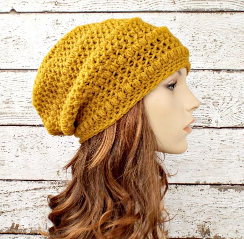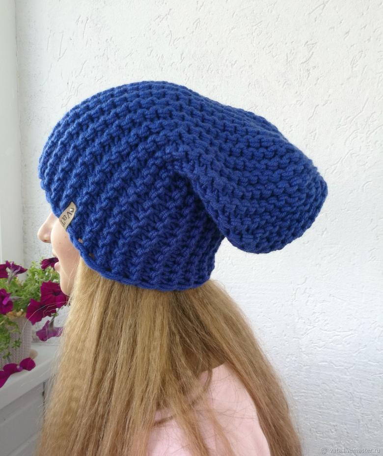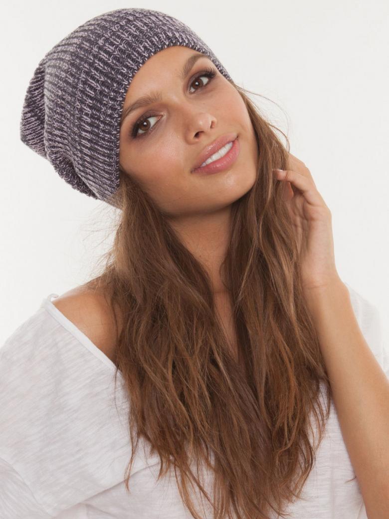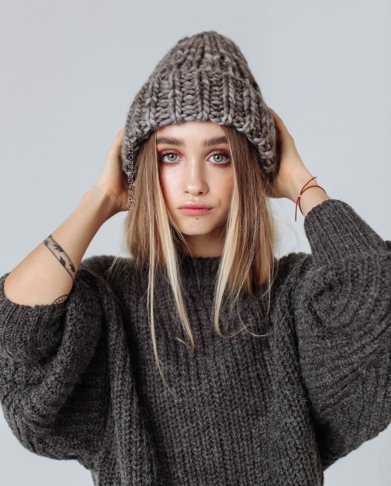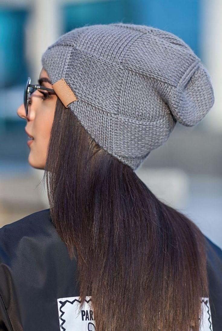 Le creux sur la couronne donne un style négligé à l'image. Vous pouvez porter cette pièce en l'inclinant sur le côté ou en la rassemblant à l'arrière de la tête. La méthode de tricotage d'un bonnet bini par des aiguilles à couronne allongée ne diffère que par la longueur du tissu principal du produit.