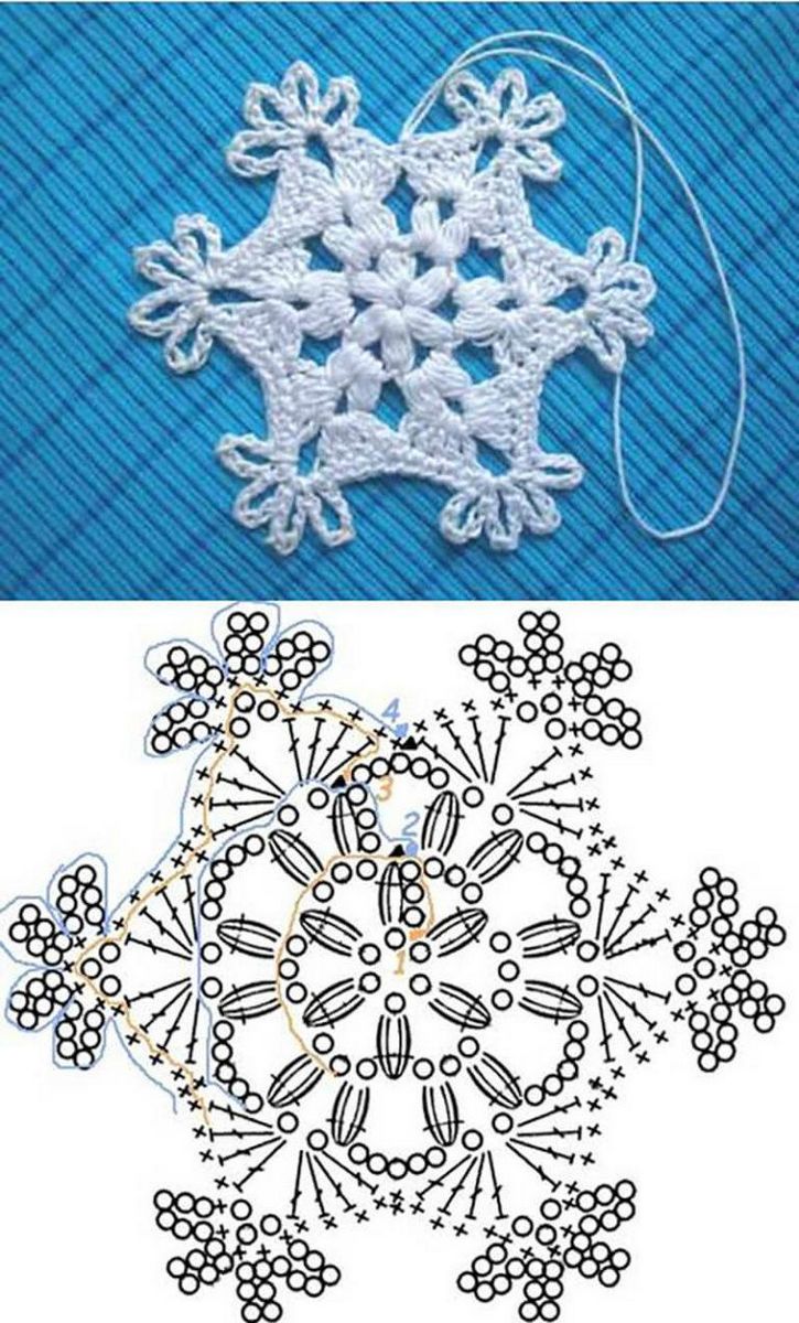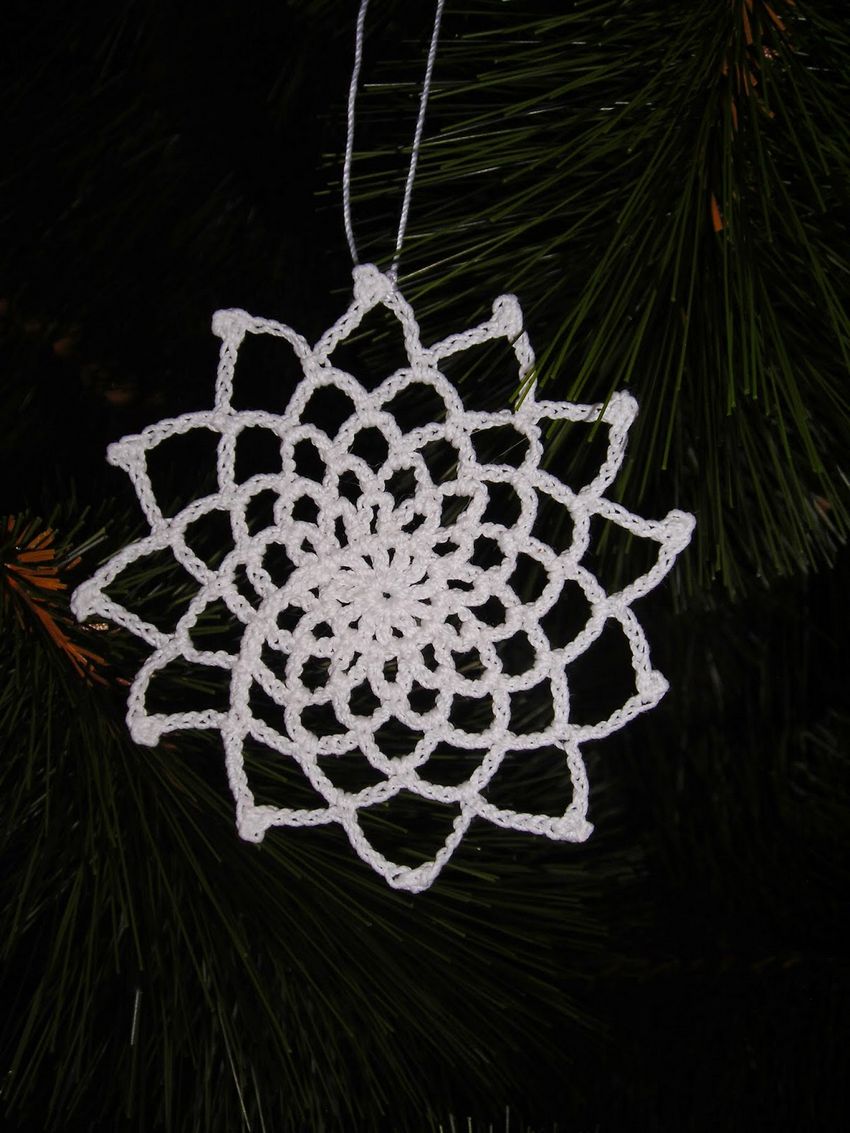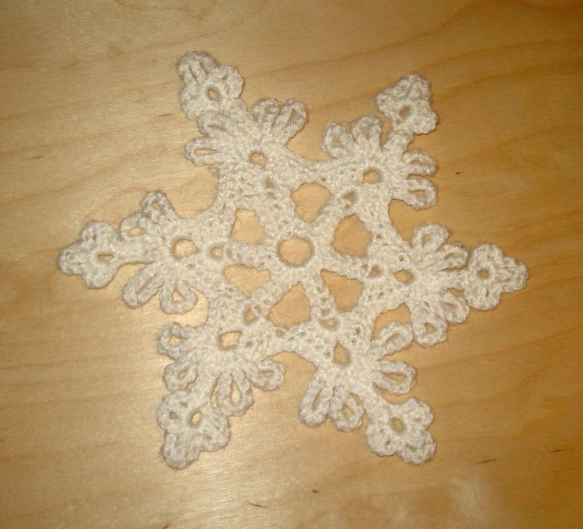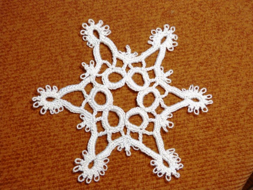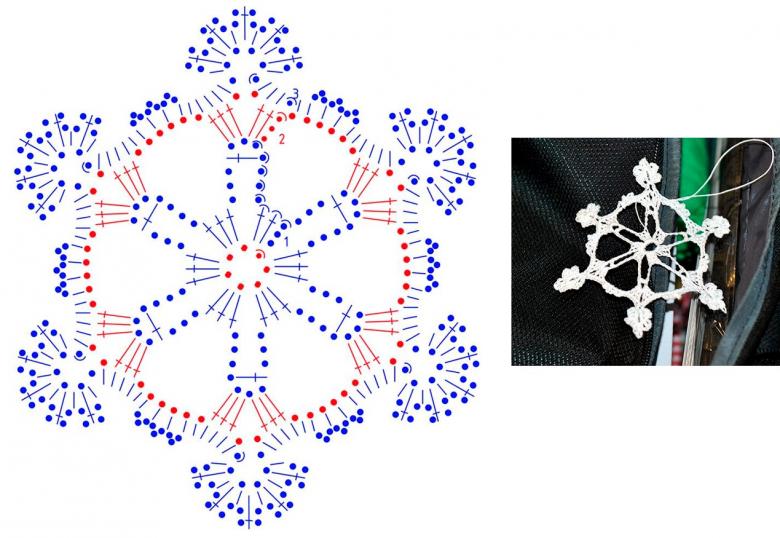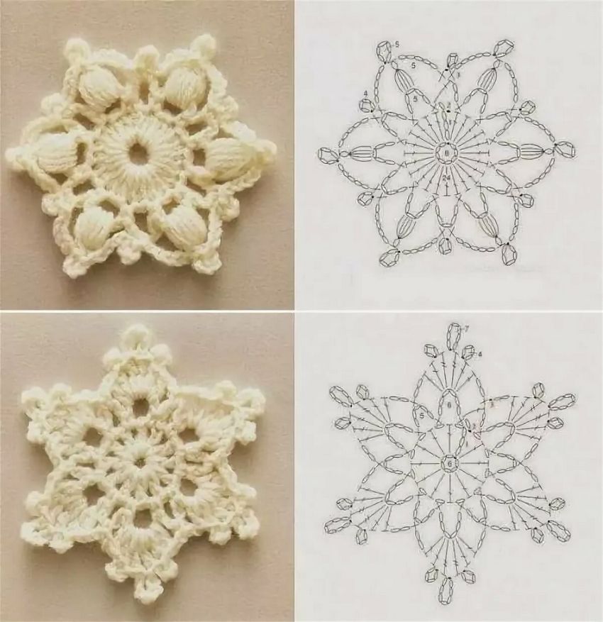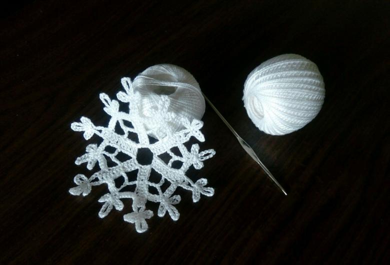 Tricotez des flocons de neige à base de boucles d'air avec une colonne, avec ou sans point. Le fil peut être pris dans n'importe quelle épaisseur, mais si vous voulez créer un flocon de neige fragile et sans poids, il est préférable de prendre un fil aussi fin que possible.