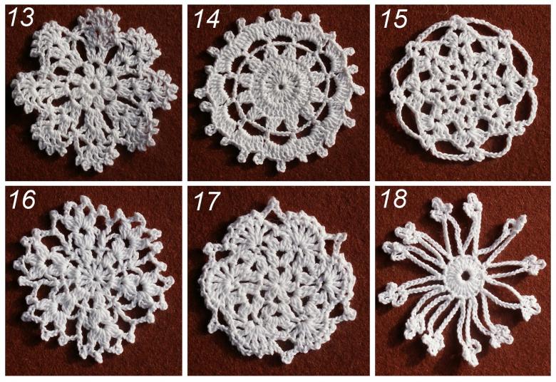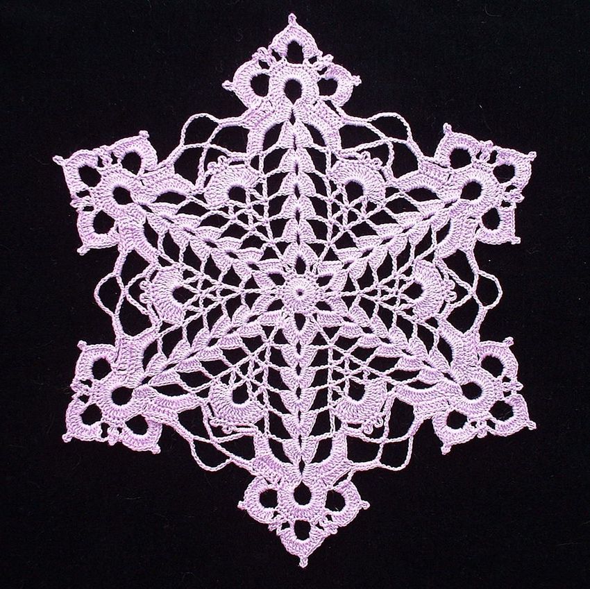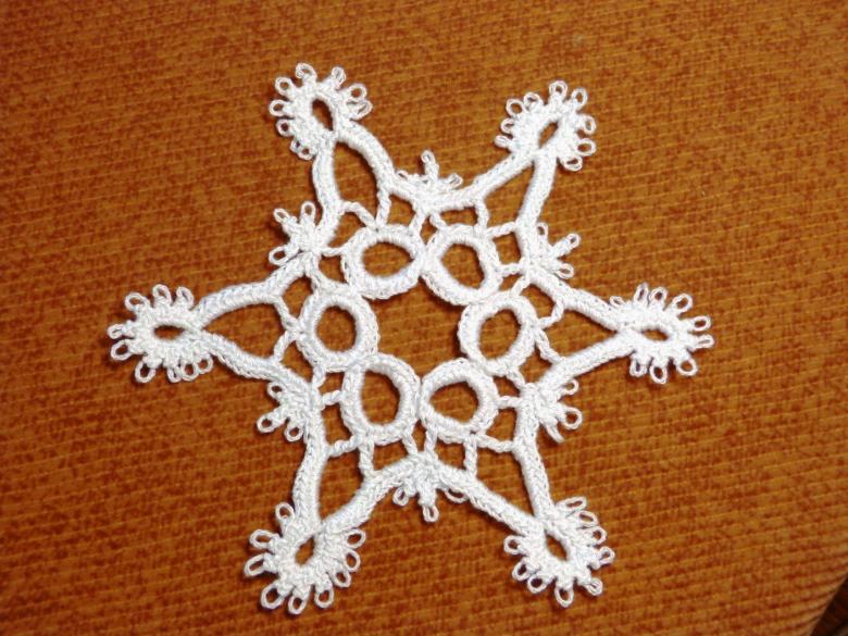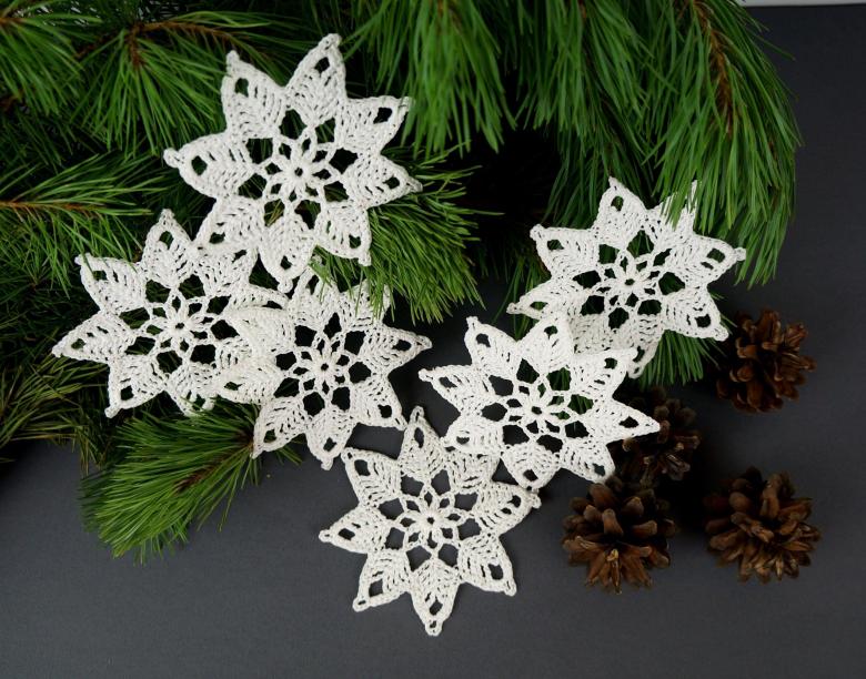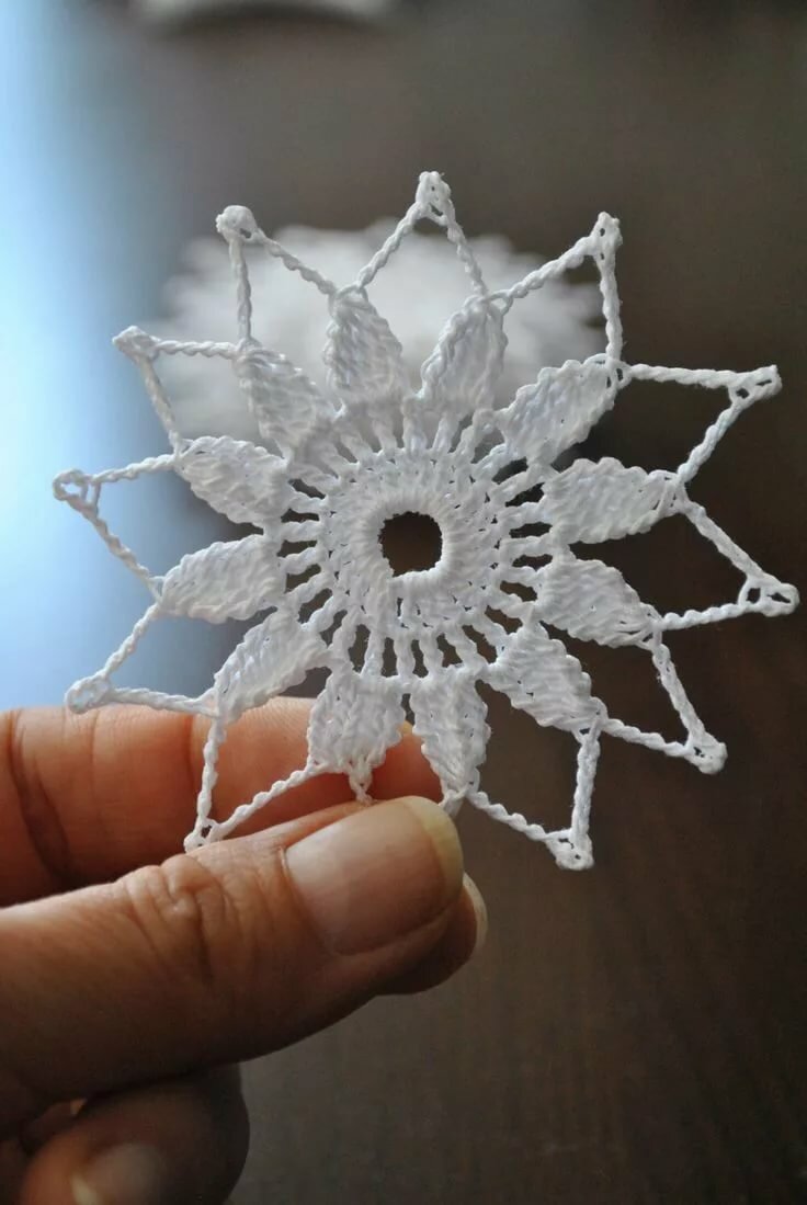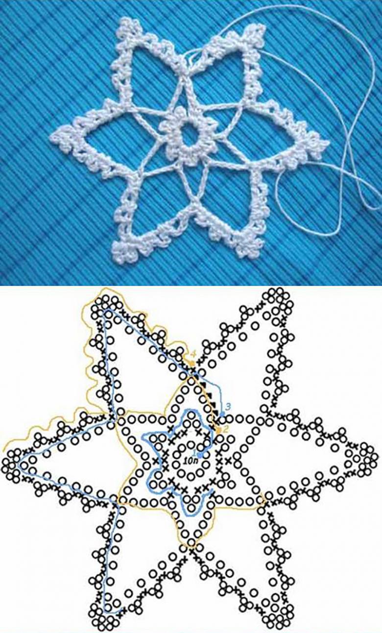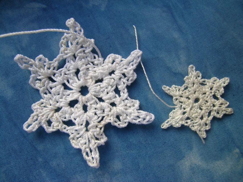 Tricotez des flocons de neige à base de boucles d'air avec une colonne, avec ou sans point. Le fil peut être pris dans n'importe quelle épaisseur, mais si vous voulez créer un flocon de neige fragile et sans poids, il est préférable de prendre un fil aussi fin que possible.