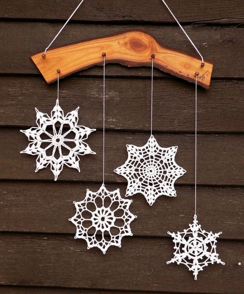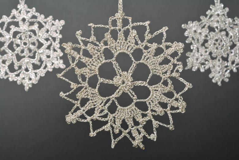 Par exemple, les flocons de neige peuvent être utilisés pour faire des "Bonne Année" entiers et plus encore. Les lettres sont attachées les unes aux autres, tricotées à partir de petits flocons de neige. Une telle composition est toujours impressionnante. Et les petits flocons de neige constituent une superbe décoration pour tout arbre de Noël, la maison ou le bureau.