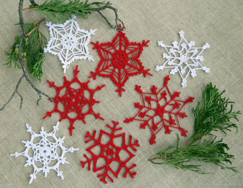 Vous pouvez créer des produits non seulement dans la gamme blanche traditionnelle. Essayez différentes combinaisons de couleurs, expérimentez le lurex, utilisez des fils avec un éclat métallique, des inclusions d'or ou d'argent. Les couleurs vives, d'ailleurs, créent une ambiance festive plus que de simples flocons de neige blancs.