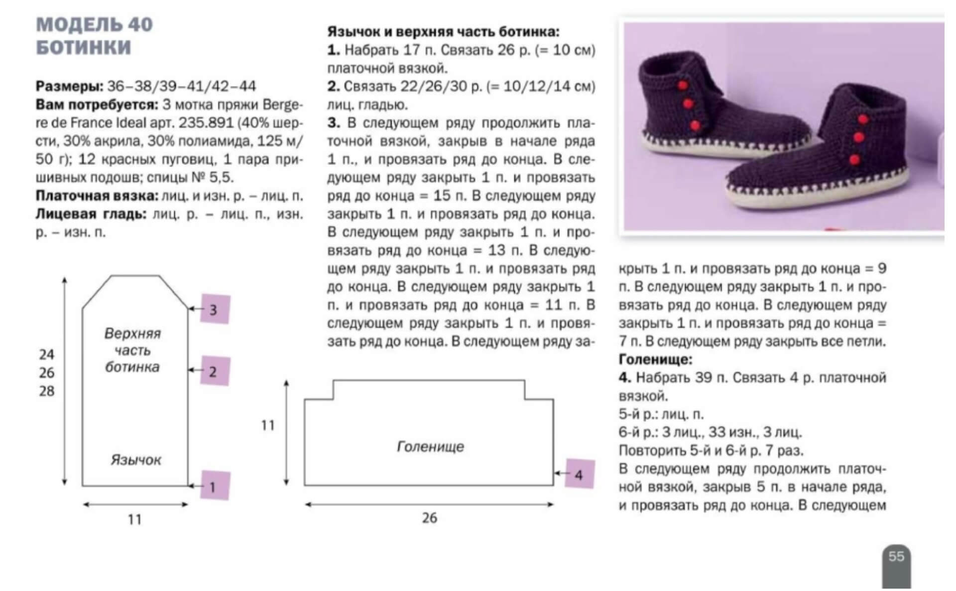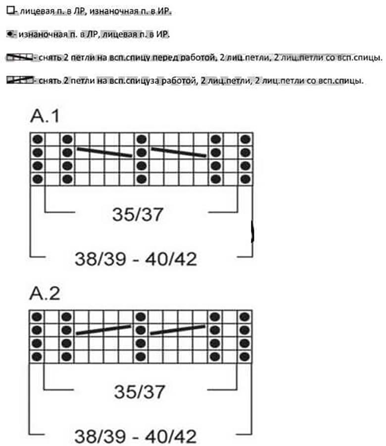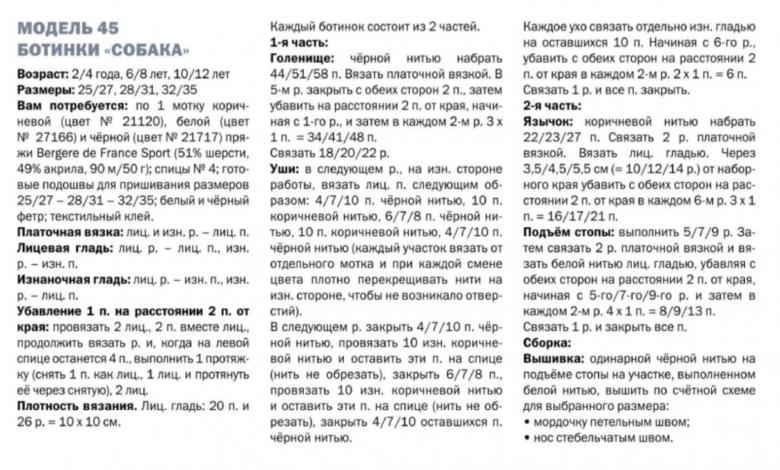 - Les bords de l'orteil sont ajoutés avec 18 points de chaque côté. Cela laissera un total de 45 points de suture. Les 40 rangs suivants sont tricotés comme suit : 1 crochet, 5 plaids, 1 faux, 4 serrures, 1 faux, 21 faces, 1 faux, 4 serrures, 1 faux, 5 plaids, 1 cr. Les quatrièmes points sont réalisés en boucle : 2 points sont placés sur le troisième spit, 2 faces, 2 faces du spit supplémentaire. Les rangs arrière sont effectués conformément à la figure.