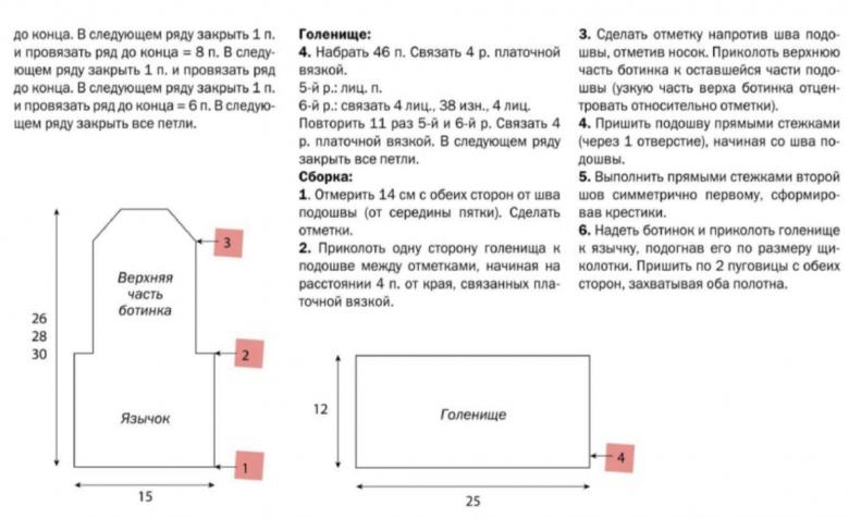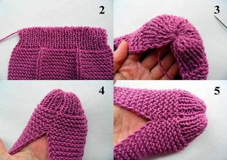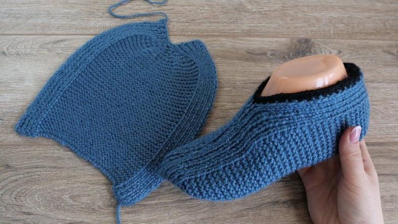 Les rangs de points suivants sont cousus ensemble, ajustant la profondeur de la forme. Reste à assembler le talon : le fil est tiré au milieu du tricot et cousu, et les côtés sont également cousus ensemble. Les chaussons ainsi obtenus peuvent être décorés de perles. Même un débutant peut tricoter avec une méthode aussi simple pour tricoter avec des aiguilles.