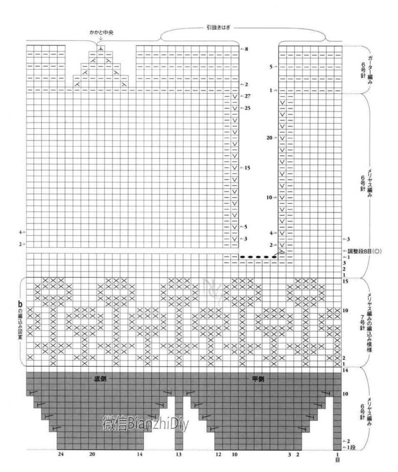 - 35ème rangée - 11 droites, puis en ajoutant des mailles de un à deux, 8 faces, et en ajoutant à nouveau des mailles ;
