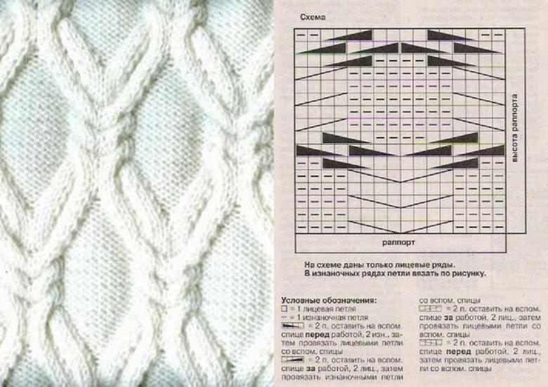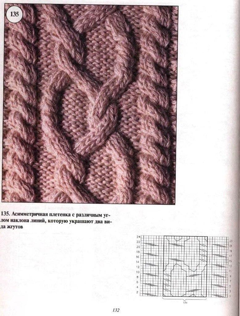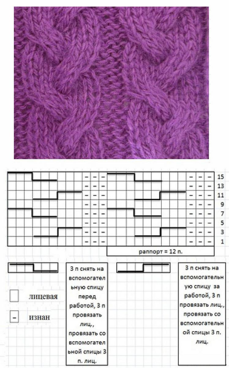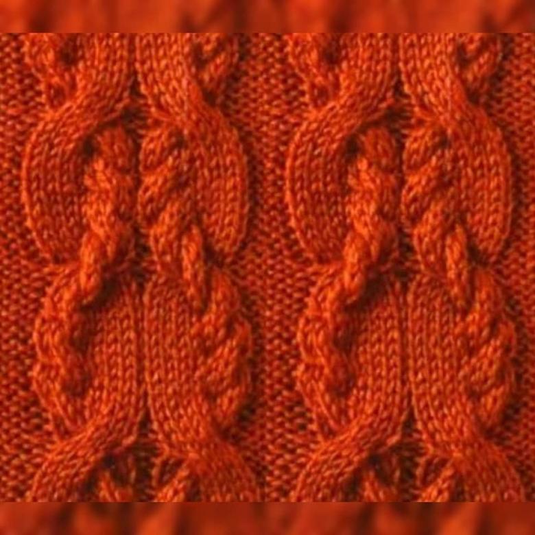Ce type de tresse est constitué de deux croix, alternées en quinconce. Il s'agit d'un type de motif plutôt créatif, dans lequel toute dilution et improvisation est possible. Pour le motif, vous devez prendre tellement de boucles qu'il vous reste 12 boucles pour faire des doubles boucles. Dans ce cas, avec deux bords et quatre au bord de la tresse, vous obtenez un total de 17 points. Le modèle de tricotage sera le suivant :