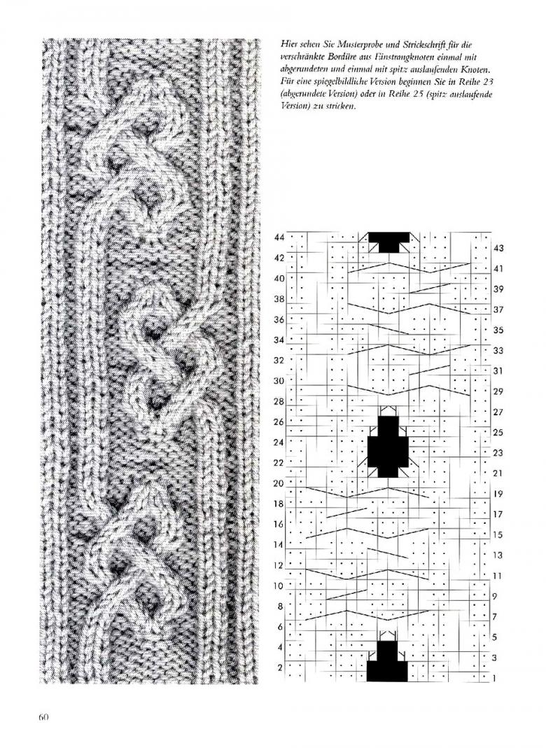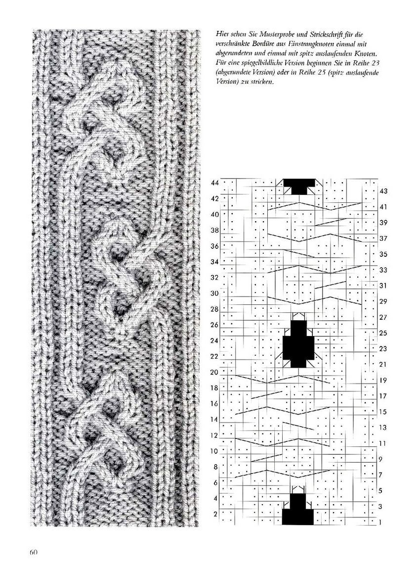 - Le rang 5 est croisé, ce qui se fait en faisant à nouveau une boutonnière, deux fausses et trois mailles gauches sans aiguille et en les gardant devant le tissu jusqu'à ce que les trois mailles droites suivantes soient terminées ; ensuite, remettez les mailles de l'aiguille supplémentaire sur l'aiguille principale et tricotez à nouveau en suivant le motif jusqu'au rang 13, dans lequel on fait à nouveau le croisement comme au rang 5.