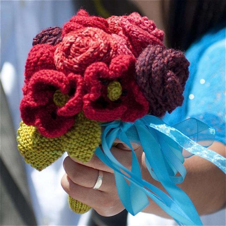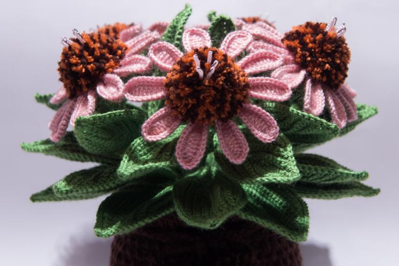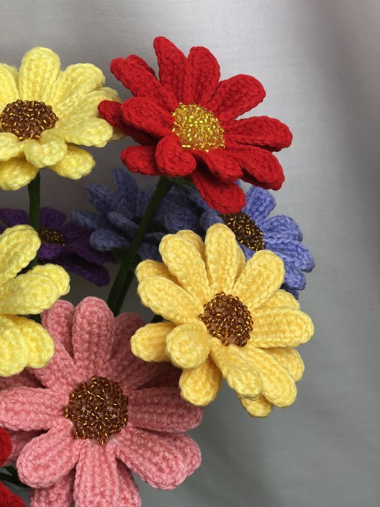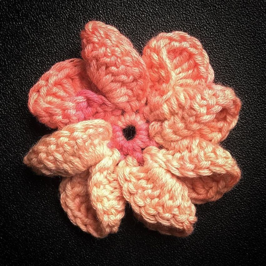 Il reste donc la dernière rangée de pétales. Dans la deuxième maille, tricotez 7 CBN et SBN. Encore une fois, coupez le fil et cachez toutes les extrémités. La fleur volumineuse est prête !