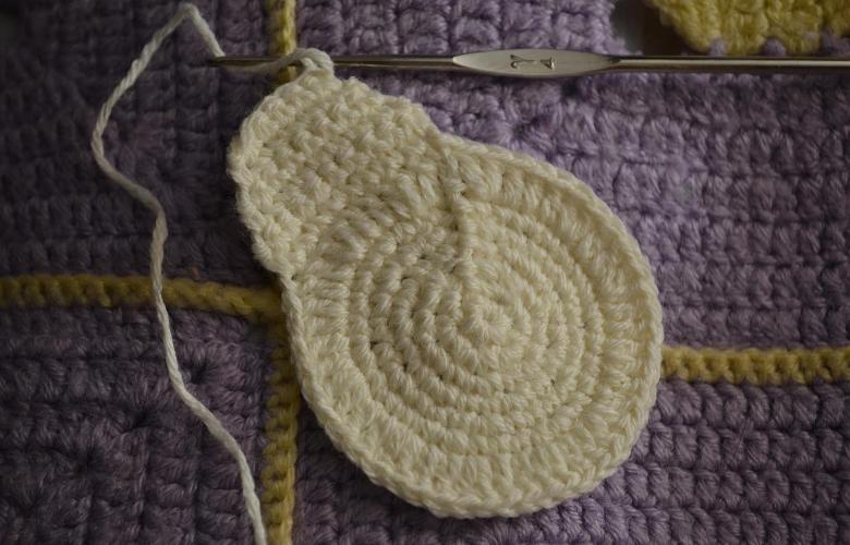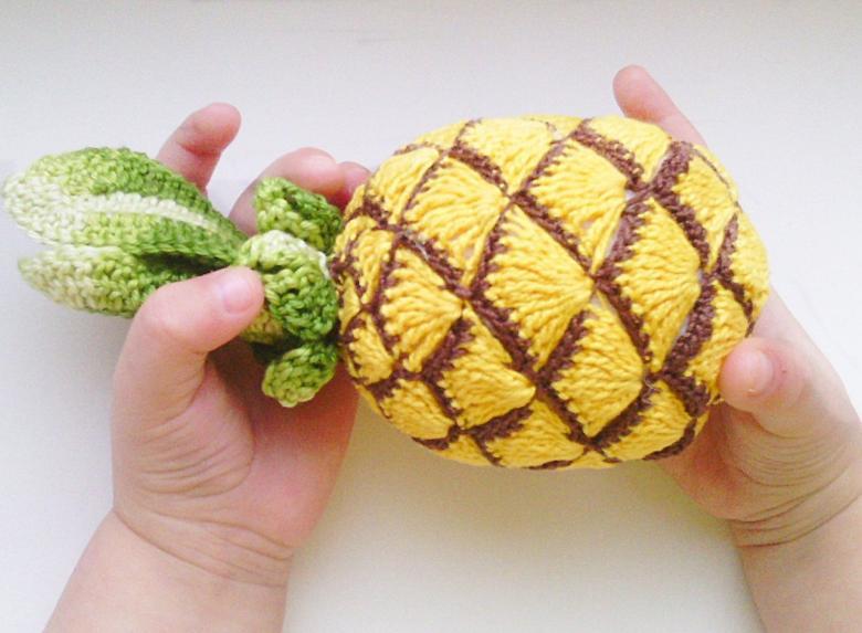 La technique de tricotage des motifs est particulièrement adaptée à la réalisation d'un ananas. Le motif le plus approprié est l'image d'une fleur africaine dans un hexagone. Tous les motifs doivent être cousus ensemble (en forme d'ananas). Les feuilles sont tricotées séparément et cousues proprement sur le fruit.