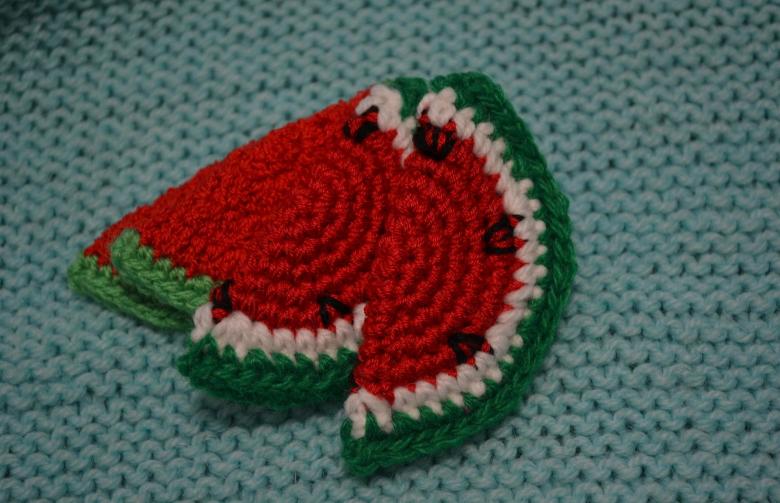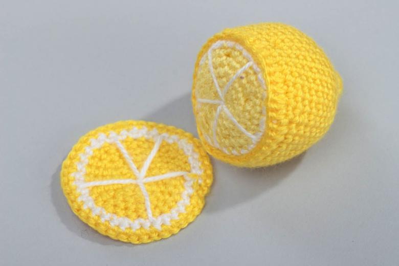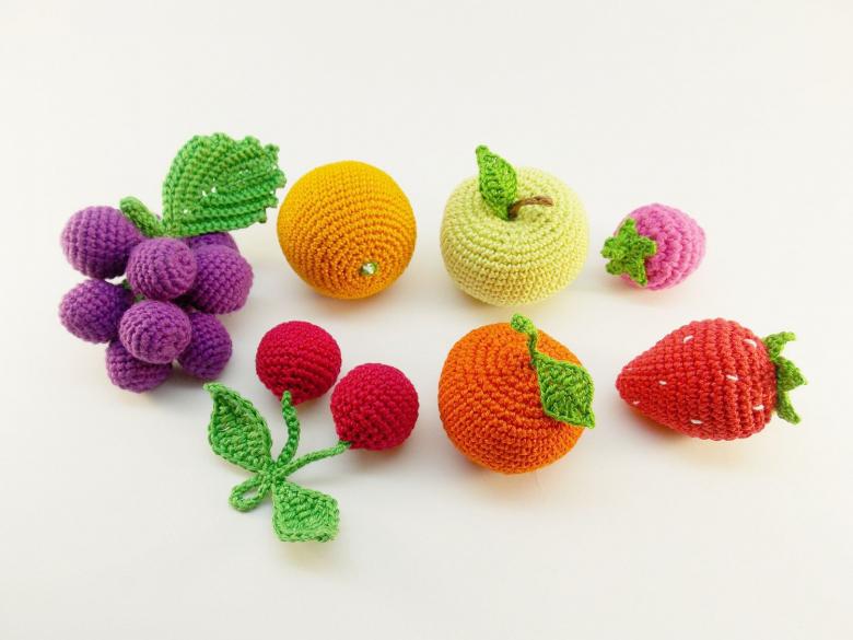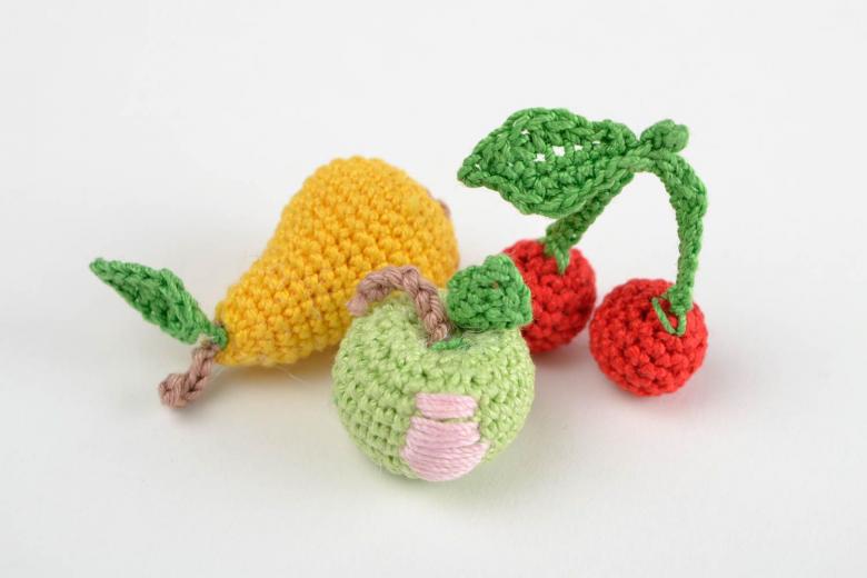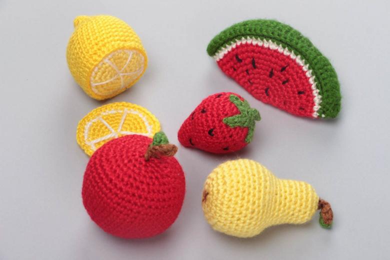 Si vous voulez, vous pouvez tricoter des petites tranches de fruits, des petites baies. Ils font d'excellents aimants pour le réfrigérateur. Autre domaine d'application possible des mini-fruits : la fabrication de broches artisanales, pour lesquelles il faut fixer une petite épingle sur les vêtements.