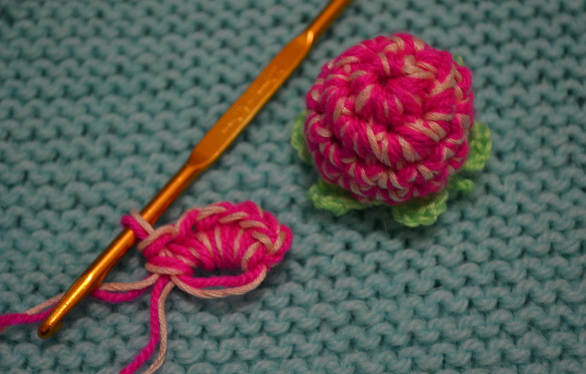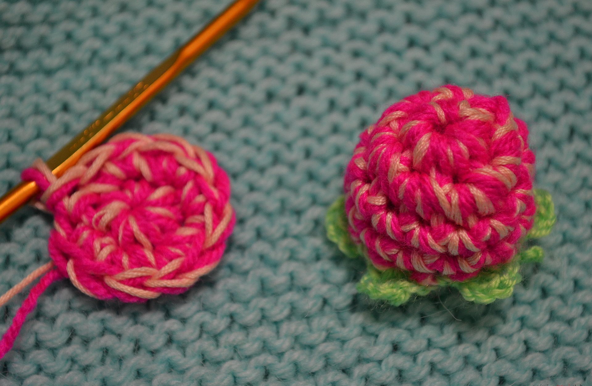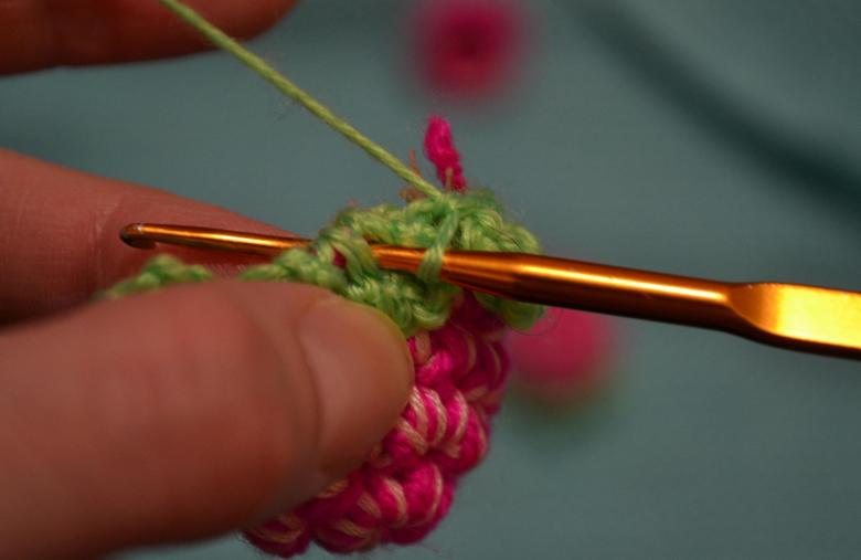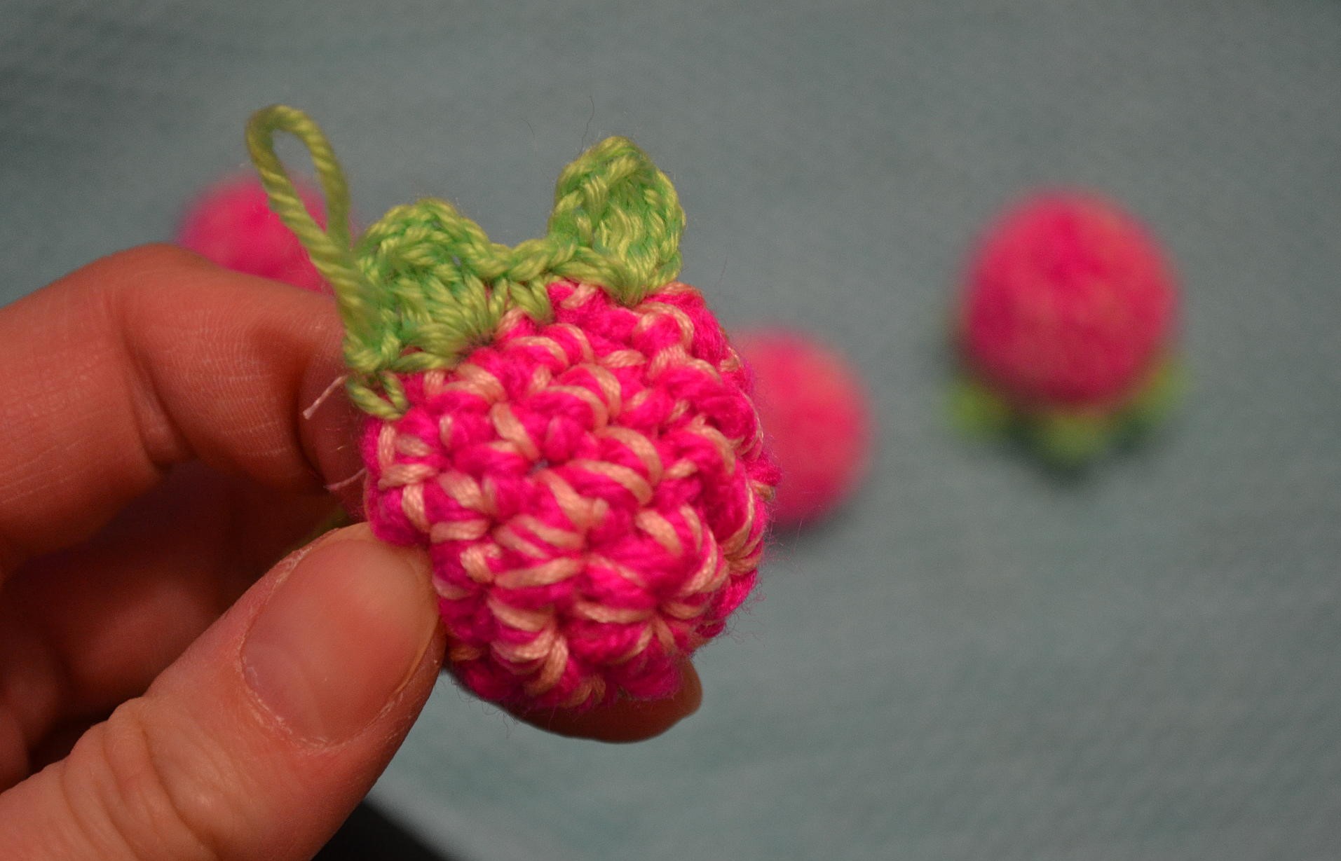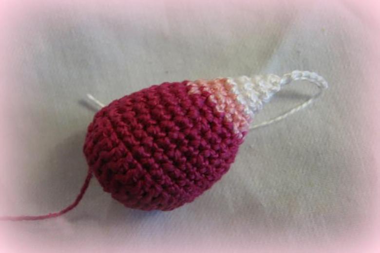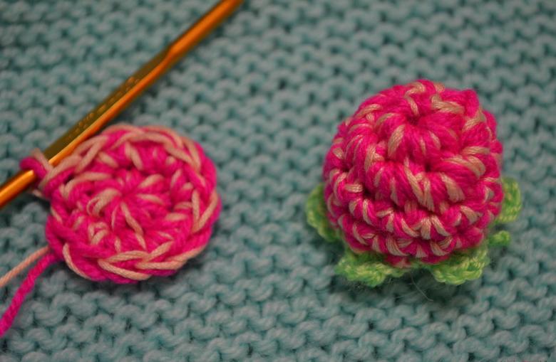 - Le fil est coupé, les boucles restantes sont attachées pour "serrer" le produit fini. En outre, vous pouvez tricoter un bâton et une feuille.