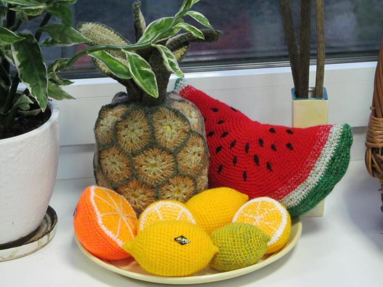 Le crochet à fruits est également très utilisé dans la décoration intérieure. Ils peuvent être placés dans un vase dans la cuisine. Les grands fruits crochetés sont également très beaux et remplacent avec succès les coussins de canapé ordinaires.