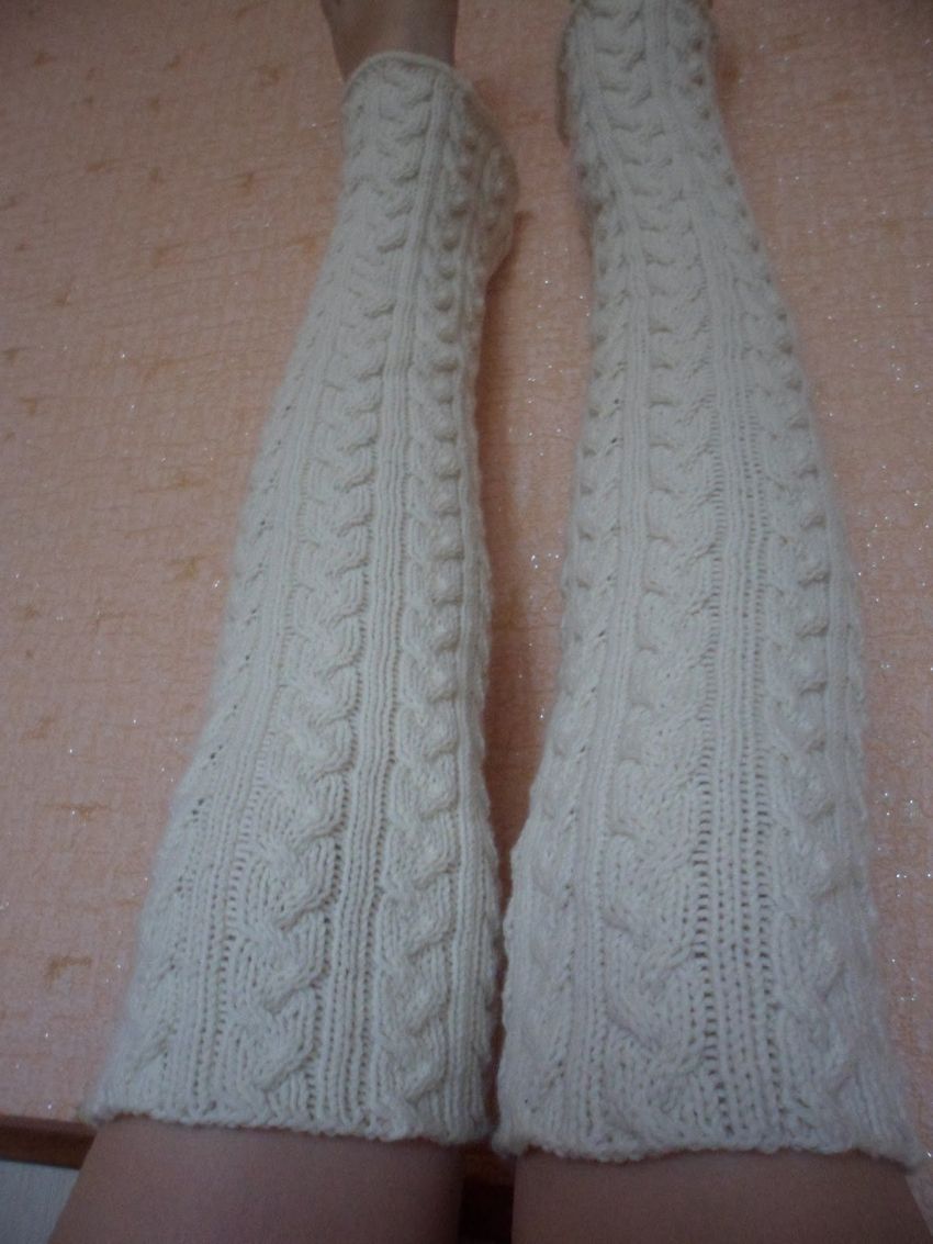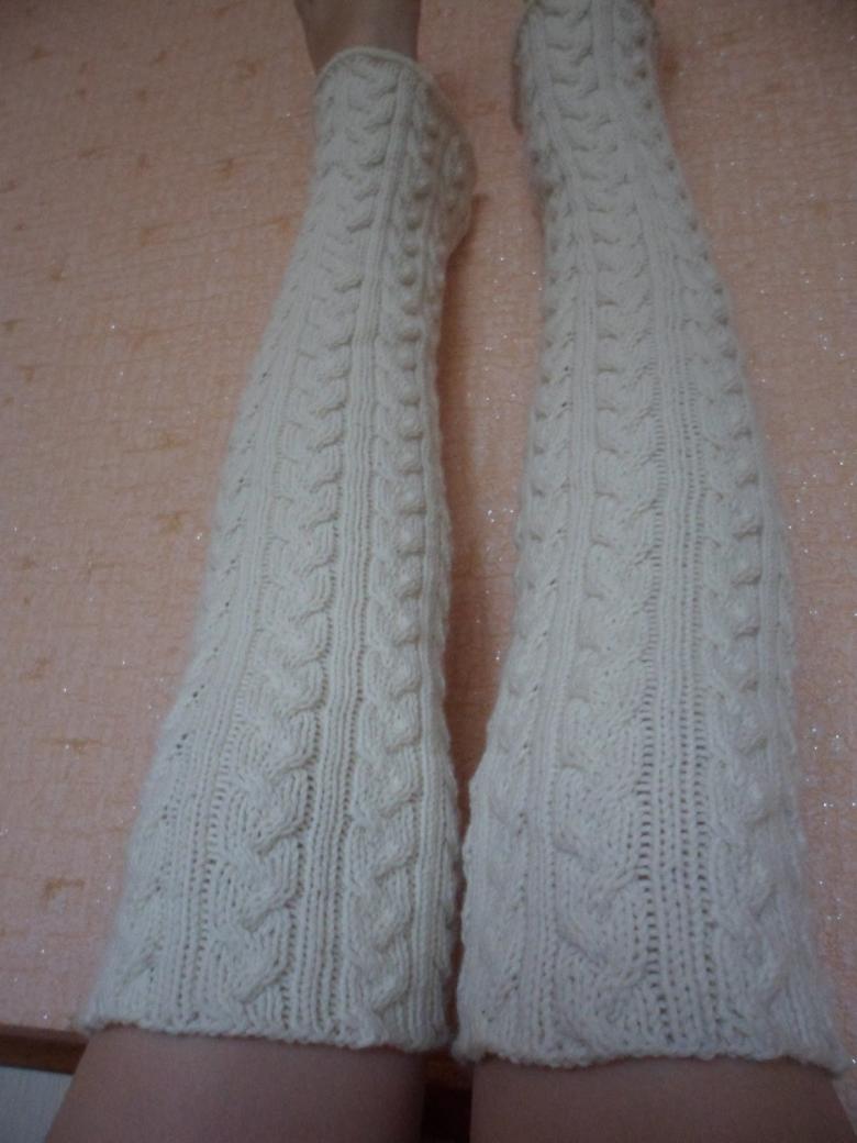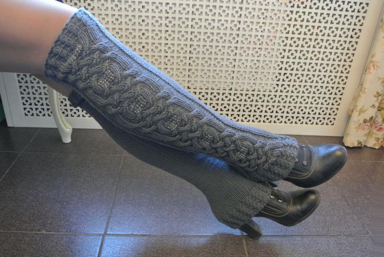 L'avantage de cette technique de tricotage est que le produit est fabriqué sans couture. Lors du travail, il suffit d'ajouter correctement un certain nombre de boucles, de sorte que le côté qui était au niveau de la cheville soit plus étroit que la partie supérieure, qui est au niveau du mollet.