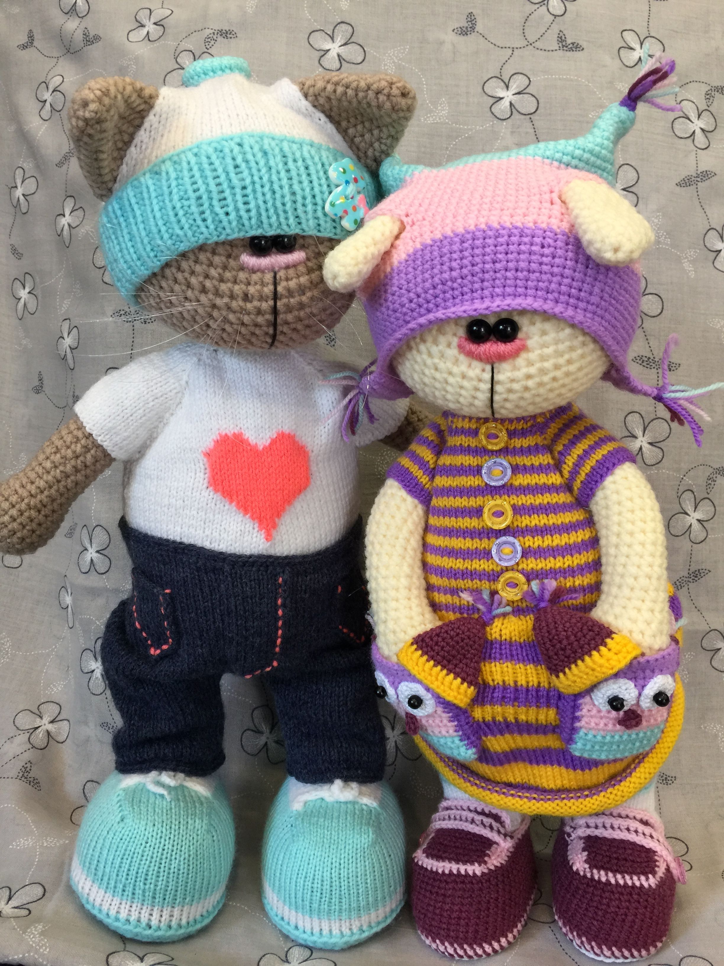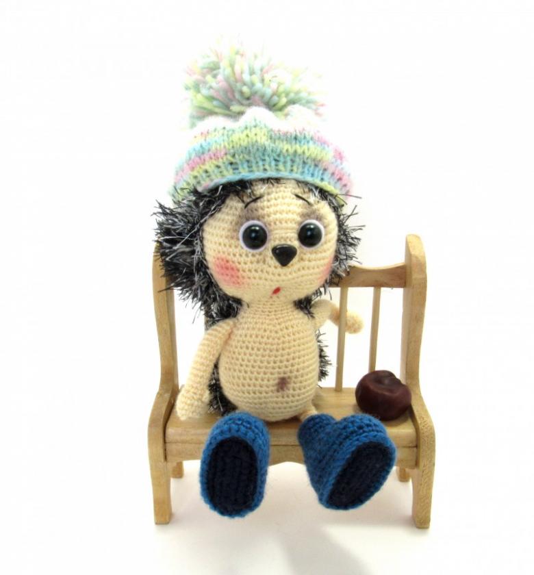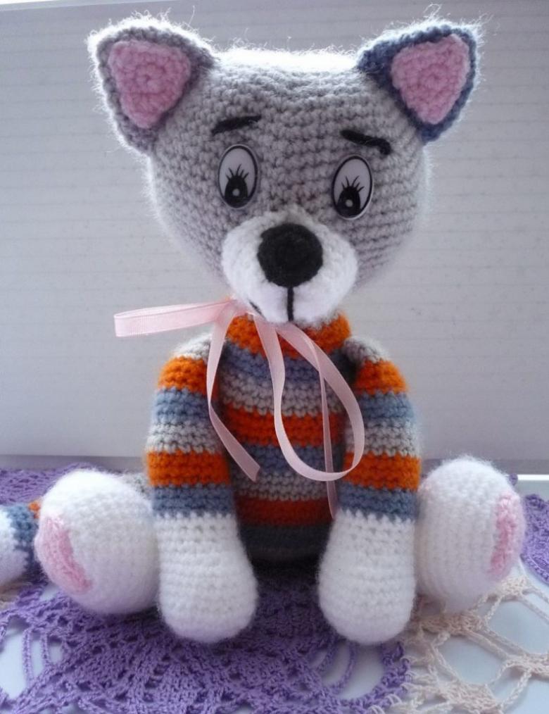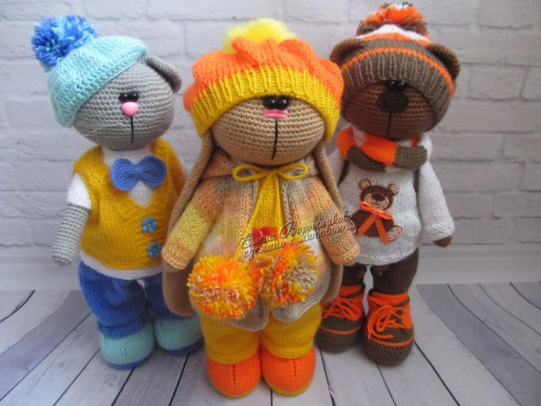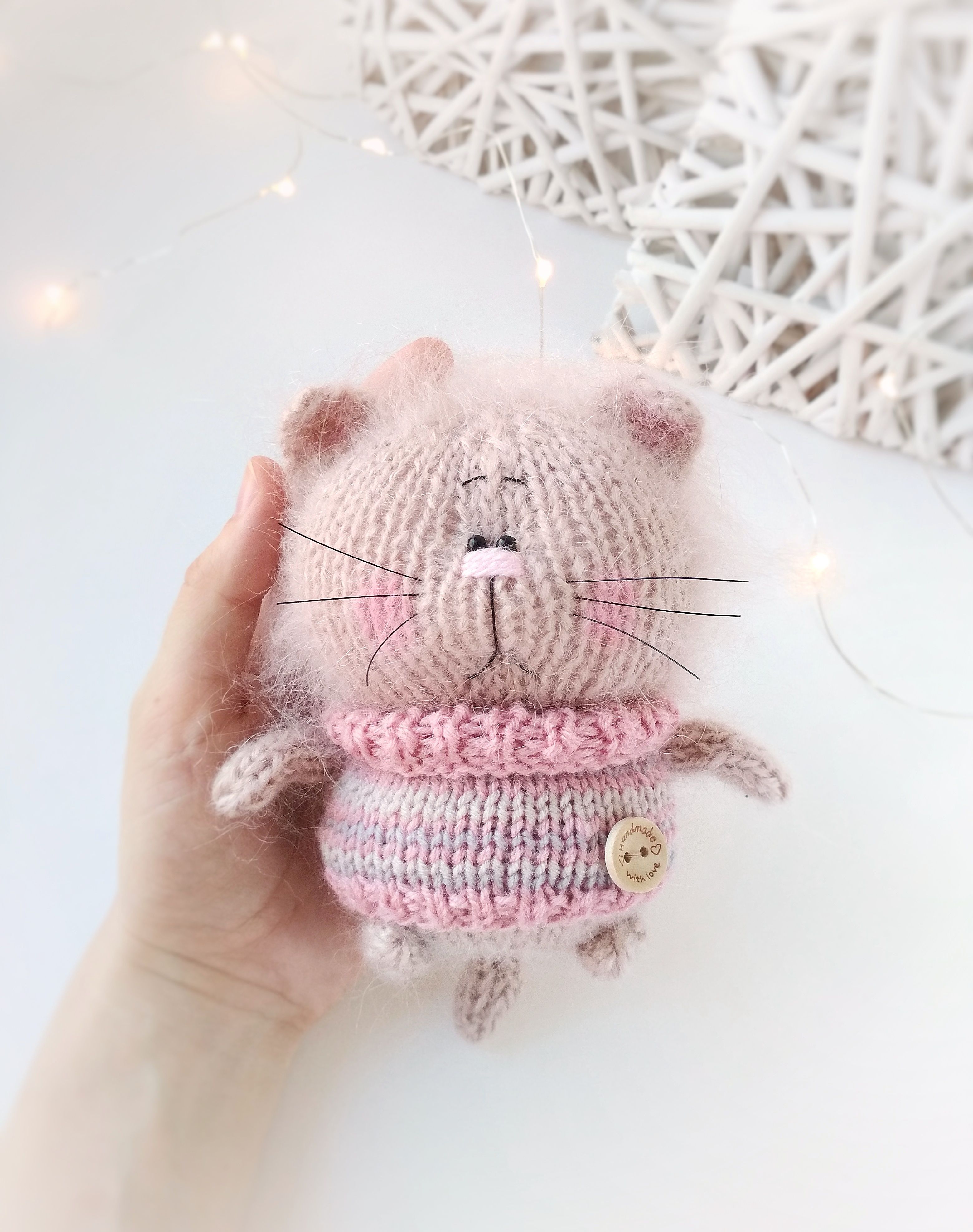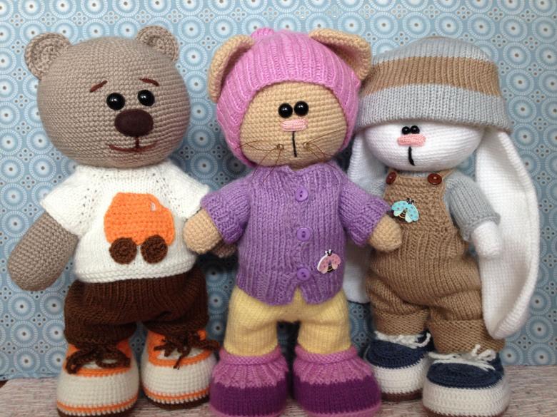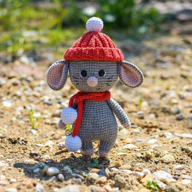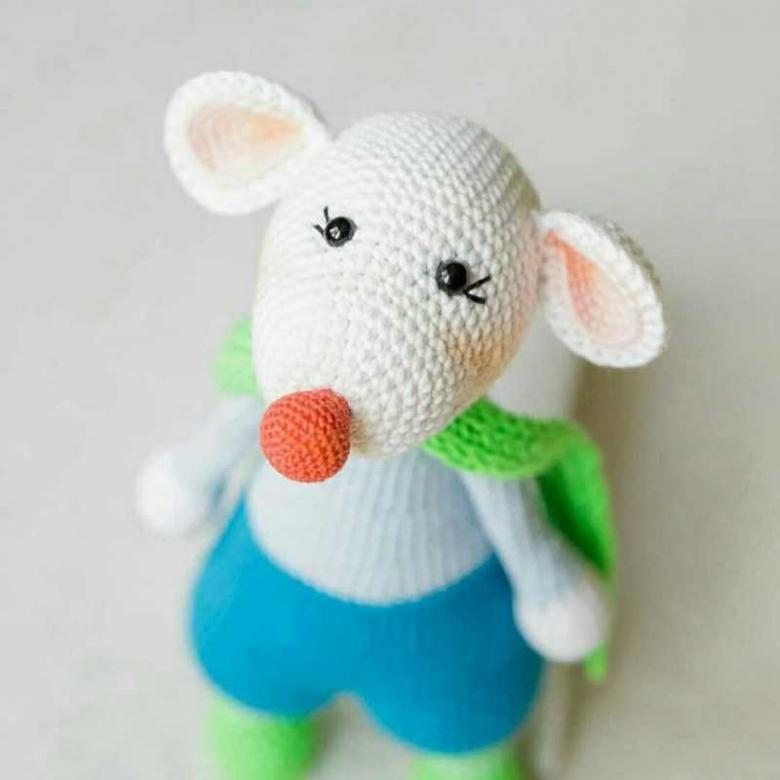 Museau peint à la peinture acrylique. Les vêtements sont tricotés avec des fils plus fins.