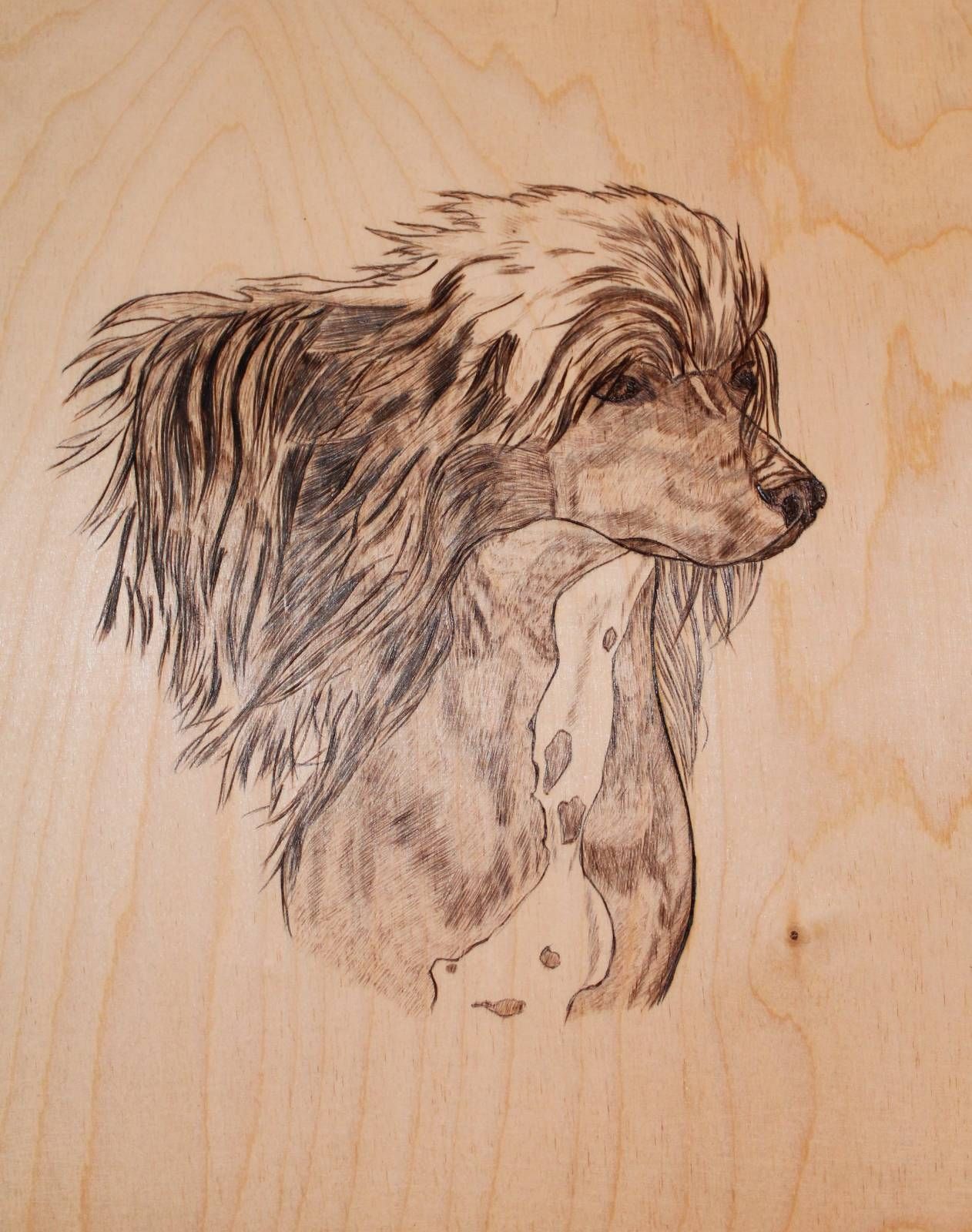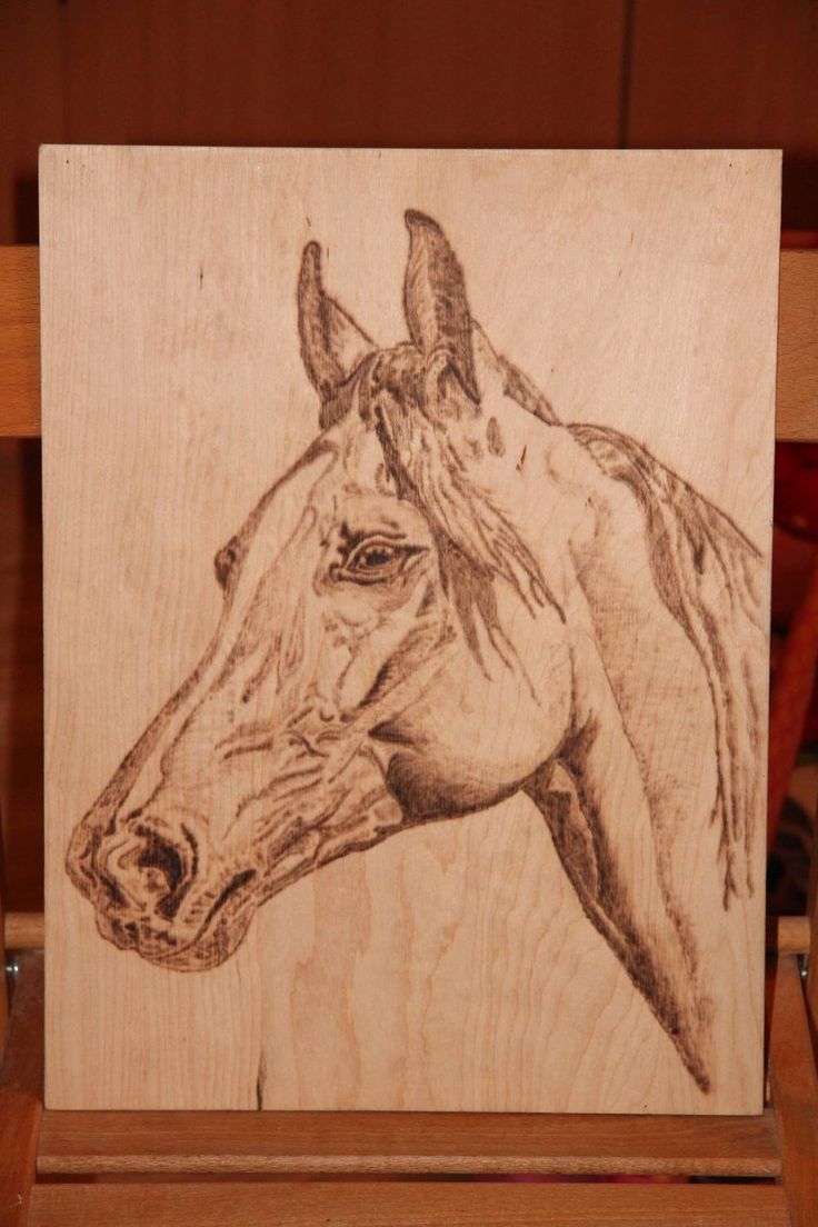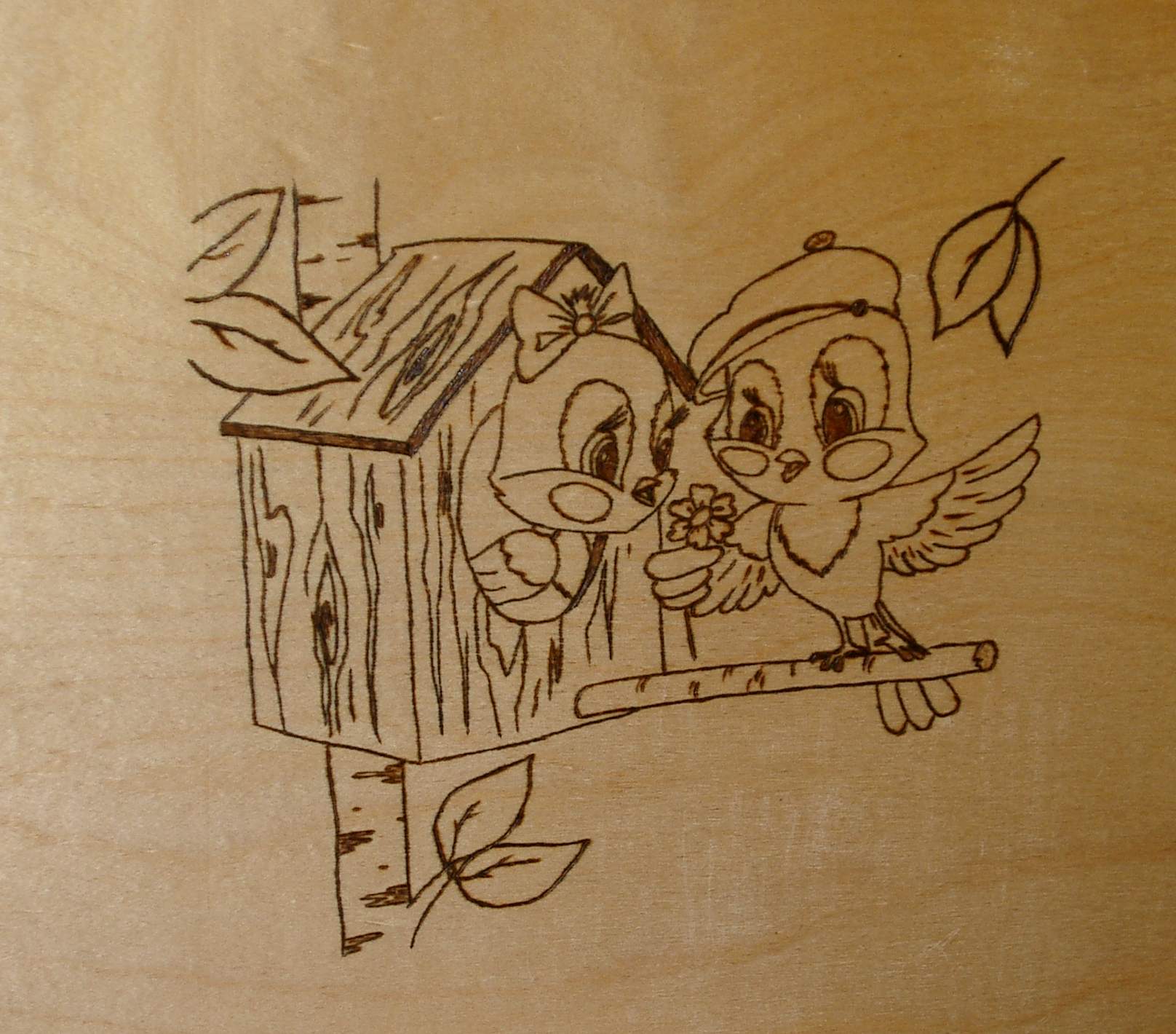 - Les lignes principales et les contours de l'image sont d'abord brûlés, puis les détails et les hachures sont effectués.